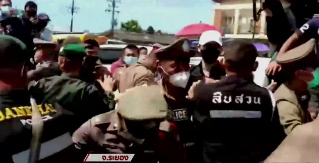 หลังจากนั้นตำรวจได้ระดมกำลังเข้าควบคุมสถานการณ์ ก่อนเร่งนำตัวผู้ต้องหาขึ้นรถกระบะและขับออกไป เบื้องต้นมีรายงานว่าผู้ต้องหาอาจได้รับบาดเจ็บเล็กน้อย เพราะใส่หมวกกันน็อก และเจ้าหน้าที่ต้องยกเลิกการทำแผนทันที. – สำนักข่าวไทย