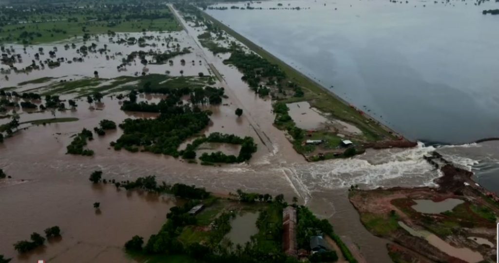 นครราชสีมา 27 ก.ย. – ภาพมุมสูง อ่างลำเชียงไกร ตอนล่าง จ.นครราชสีมา มวลน้ำมหาศาลทะลักแนวคันดิน ท่วมซ้ำหลายพื้นที่