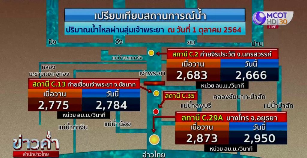 ส่วนปริมาณน้ำไหลผ่านเขื่อนต่างๆ เมื่อเปรียบเทียบกับเมื่อวาน เริ่มที่สถานีค่ายจิรประวัติ จังหวัดนครสวรรค์ จุดที่อยู่เหนือเขื่อนเจ้าพระยา วันนี้มีปริมาณน้ำไหลผ่าน 2,666 ลูกบาศก์เมตรต่อวินาที ใกล้เคียงกับเมื่อวาน ที่มีน้ำไหลผ่าน 2,683 ลูกบาศก์เมตรต่อวินาที ไม่ต่างจากท้ายเขื่อนที่จังหวัดชัยนาท มีการไหลของน้ำลดลงมาจากเมื่อวานจาก 2,775 เป็น 2,784 ลูกบาศก์เมตรต่อวินาที ซึ่งตัวเลขการไหลผ่านของน้ำ แม้จะลดลงนิดหน่อย แต่ก็วางใจไม่ได้ เพราะแม่เจ้าพระยามีการระบายน้ำต่อเนื่องมาหลายวัน แม้แต่ละวันจะขยับขึ้นลงไม่มาก แต่คนที่อยู่ริมน้ำได้รับผลกระทบแน่นอน ส่วนสถานีบางไทร จังหวัดพระนครศรีอยุธยา วันนี้มีน้ำไหลผ่านขยับขึ้นจาก 2,873 ลูกบาศก์เมตรต่อวินาที เป็น 2,950 ลูกบาศก์เมตรต่อวินาที
