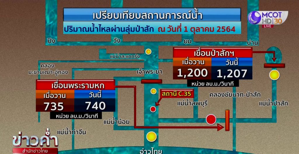 ตั้งแต่ช่วงเช้า เขื่อนเจ้าพระยาปรับเพิ่มการระบายน้ำจาก 2,779 ลูกบาศก์เมตรต่อวินาที เป็น 2,801 ลูกบาศก์เมตรต่อวินาที เพื่อต้องการผลักดันน้ำลงทะเลให้ได้มากที่สุด รองรับการคาดการณ์ที่ว่าจะมีพายุเข้า และน้ำทะเลหนุนสูงในช่วงกลางเดือนนี้ ทำให้ตอนนี้ปริมาณน้ำท้ายเขื่อนสูงกว่าขีดแดงแล้ว 25 เซนติเมตร ขณะที่เขื่อนป่าสักชลสิทธิ์ วันนี้มีน้ำเข้าอ่างเพิ่มขึ้นมากกว่าเมื่อวานอีก น้ำจึงเกินความจุอ่างไปถึง 107% จำเป็นต้องระบายน้ำออกมากถึง 104.276 ล้านลูกบาศก์เมตรต่อวัน