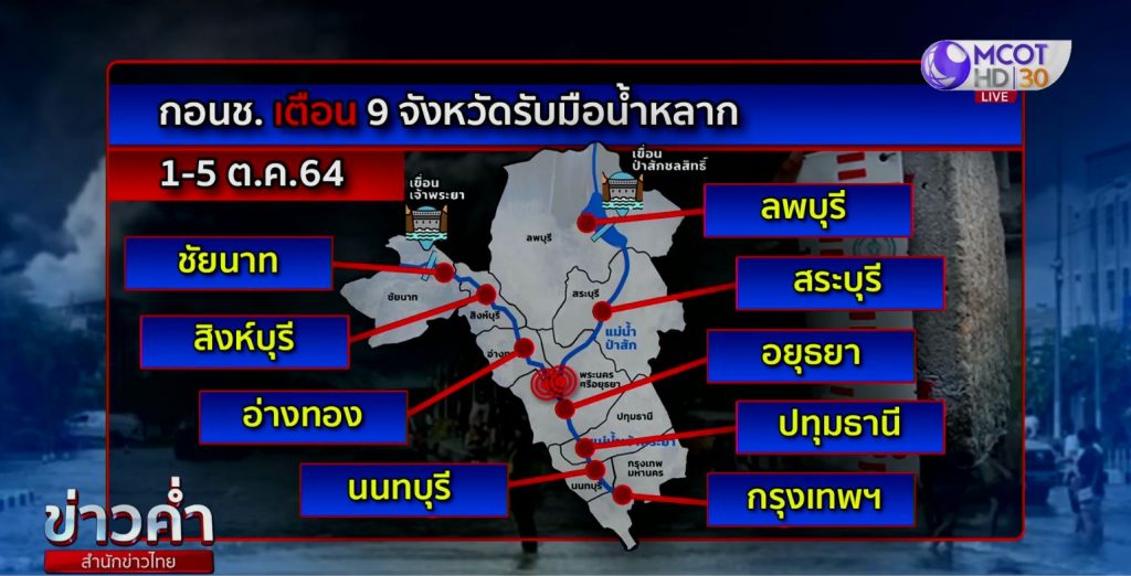 ข้อมูลนี้ตรงกับที่กองอำนวยการน้ำแห่งชาติได้ออกประกาศเตือนพื้นที่ 9 จังหวัดระวังน้ำท่วมจากการที่เขื่อนระบายน้ำเพิ่ม เพราะอย่างท้ายเขื่อนพระรามหก เมื่อวานยังเป็นจุดสีเหลืองอยู่ในระดับวิกฤติ วันนี้เปลี่ยนสีแดงคือน้ำท่วมแล้ว