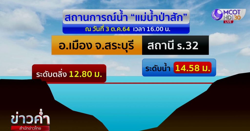 เทียบให้เห็นภาพกับสถานการณ์น้ำที่ลุ่มน้ำป่าสัก เมื่อเวลา 16.00 น. พบว่ามีน้ำที่สูงกว่าระดับตลิ่งอยู่ 2 สถานี โดยสถานีแรก S.32 อ.เมืองสระบุรี ระดับตลิ่ง 12.80 เมตร แต่มีระดับสูงถึง 14.58 เมตร หมายความว่ามีน้ำสูงกว่าระดับตลิ่งถึง 1.78 เมตร