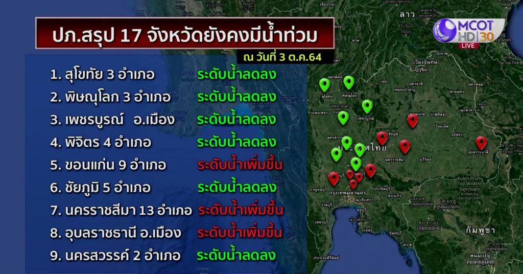 ด้านกรมป้องกันและบรรเทาสาธารณภัย รายงานจากอิทธิพลพายุโซนร้อน “เตี้ยนหมู่” ส่งผลให้เกิดน้ำท่วมฉับพลัน น้ำป่าไหลหลากในพื้นที่ 31 จังหวัด ประชาชนได้รับผลกระทบ 264,210 ครัวเรือน มีผู้เสียชีวิต 8 ราย ปัจจุบันสถานการณ์คลี่คลายแล้ว 14 จังหวัด ยังคงมีสถานการณ์ 17 จังหวัด รวม 81 อำเภอ โดยพื้นที่ที่แนวโน้มน้ำลดระดับ ลงแล้วได้แก่ สุโขทัย พิษณุโลก เพชรบูรณ์ พิจิตร ชัยภูมิ นครสวรรค์ อุทัยธานี ลพบุรี. – สำนักข่าวไทย