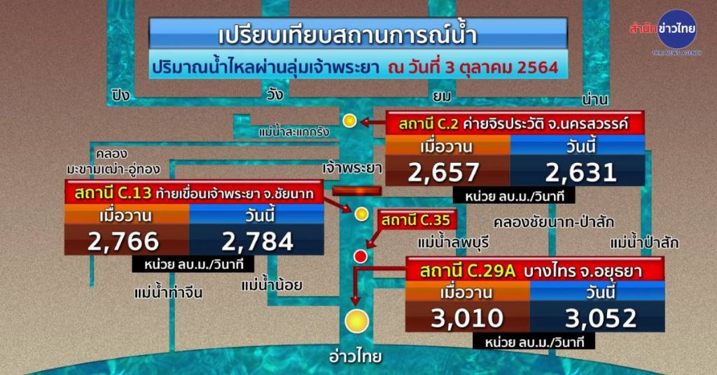 3 ต.ค. – สถานการณ์น้ำลุ่มเจ้าพระยาวันนี้ (3 ต.ค.) ที่สถานี C2 ค่ายจิรประวัติ จ.นครสวรรค์ จุดที่อยู่เหนือเขื่อนเจ้าพระยา มีปริมาณน้ำไหลผ่าน 2,631 ลูกบาศก์เมตรต่อวินาที ลดลงจากเมื่อวานเล็กน้อย ที่มีน้ำไหลผ่าน 2,657 ลูกบาศก์เมตรต่อวินาที