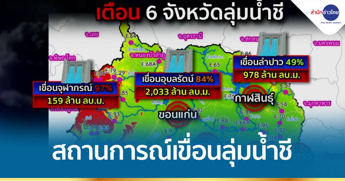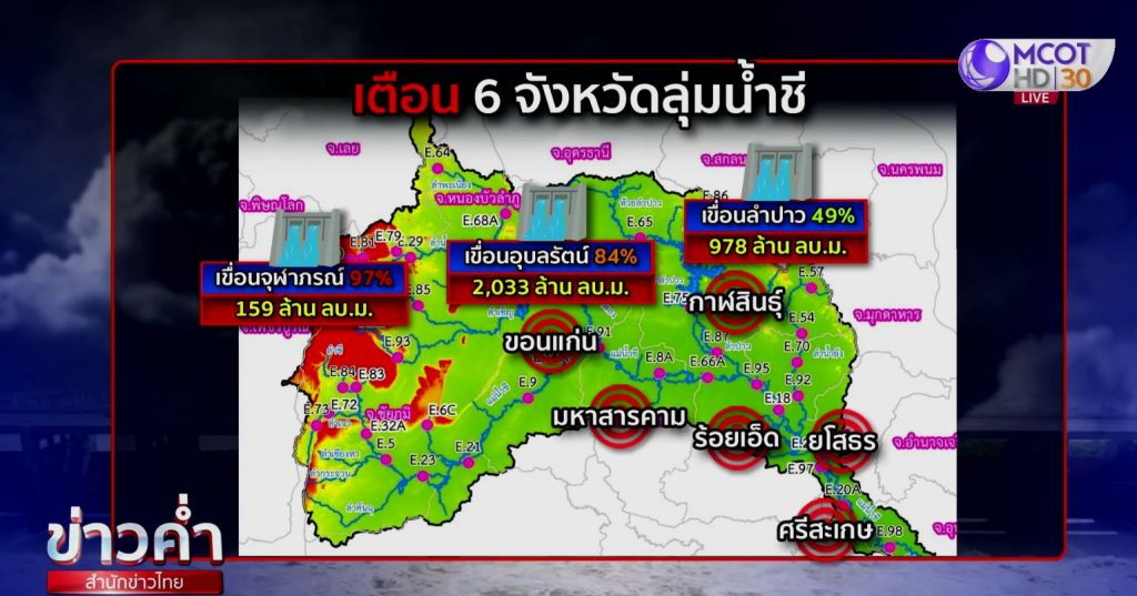 ส่วนปริมาตรน้ำใน 3 เขื่อนสำคัญของพื้นที่อีสานที่ 6 จังหวัดต้องเฝ้าระวัง เริ่มจากเขื่อนจุฬาภรณ์ จังหวัดชัยภูมิ วันนี้มีปริมาตรน้ำ 159 ล้านลูกบาศก์เมตร หรือคิดเป็น 97% เขื่อนนี้หากปล่อยน้ำออกมา น้ำจะระบายลงไปที่ลำน้ำพอง ก่อนไปรวมกันที่เขื่อนอุบลรัตน์ ที่จะระบายน้ำไปยังลุ่มน้ำชี เหนือเขื่อนมหาสารคาม ตอนนี้เขื่อนอุบลรัตน์มีปริมาตรน้ำกักเก็บอยู่ 2,033 ล้านลูกบาศก์เมตร หรือคิดเป็น 84% ขณะที่เขื่อนลำปาว หากที่นี่มีน้ำเยอะ น้ำจะไหลลงแม่น้ำชีในพื้นที่ร้อยเอ็ด แต่เขื่อนนี้ยังไม่น่ากังวล เพราะตอนนี้มีน้ำอยู่ที่ 49%