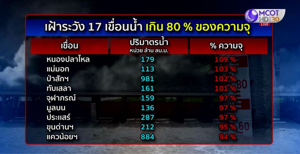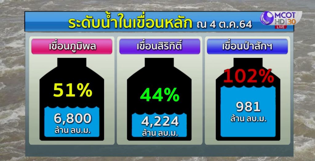 ตอนนี้ ลุ่มน้ำเจ้าพระยา และลุ่มน้ำป่าสัก พบว่าเขื่อนภูมิพลมีน้ำกักเก็บอยู่ 51% ส่วนเขื่อนสิริกิต์ 44% และป่าสักยังเกินความจุ 102%
