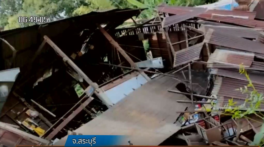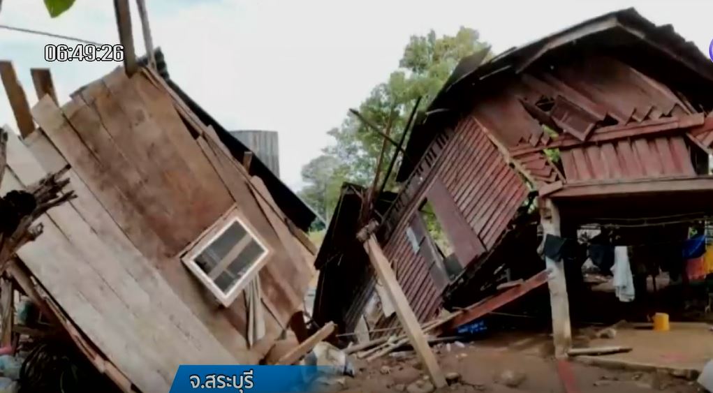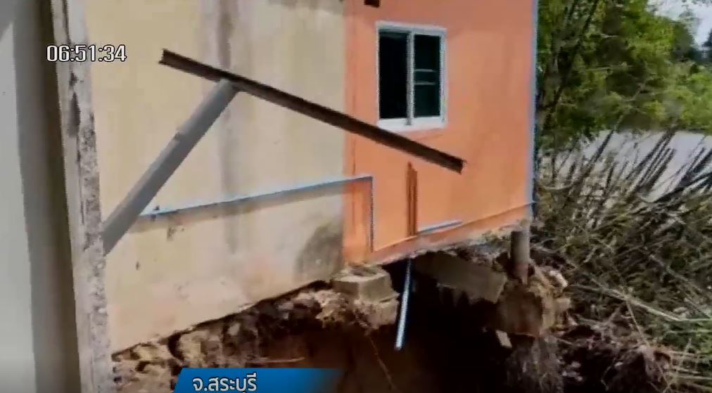 ภาพจากโทรศัพท์มือถือของชาวบ้านถ่ายคลิปขณะบ้านไม้ 2 ชั้น ถูกดินริมตลิ่งแม่น้ำป่าสักสไลด์ดึงบ้านลงแม่น้ำป่าสัก โดยเกิดเหตุบริเวณริมตลิ่ง พื้นที่หมู่ 1 ต.นาโฉง อ.เมือง จ.สระบุรี ดึงบ้านเลขที่ 4 ของนางสมคิด หญิงเหล็ก อายุ 50 ปี และบ้านลูกชายที่ปลูกติดกัน อีก 1 หลัง ถูกดึงลงแม่น้ำป่าสัก พังเสียหาย