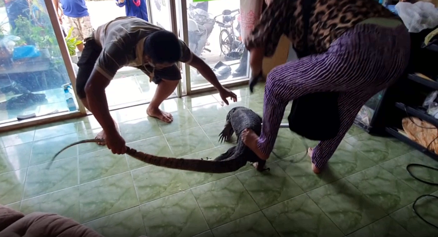 เมื่อช่วงเย็นของวันที่ 14 ต.ค.ที่ผ่านมา จนท.ศูนย์วิทยุป่อเต็กตึ๊ง(วัฒนะ) รับแจ้งจากชาวบ้านขอความช่วยเหลือให้ช่วยตัวตัวเงินตัวทองขนาดใหญ่ อยู่ในร้านอรเสริมสวย ตั้งอยู่เลขที่ 190/9 ม.5 ต.บางกะดี อ.เมือง จ.ปทุมธานี เมื่อไปถึงพบว่าเป็นร้าน “อรเสริมสวย” พบตัวเงินตัวทองขนาดใหญ่มีความยาวกว่า 2 เมตรกำลังยืนเกาะตู้ลำโพง ที่ตั้งอยู่ใกล้ประตูกระจก จนท.กู้ภัยจึงให้ห่วงคล้องที่คอแล้วช่วยกันดึงตัวออกมา ก่อนใช้เทปใสพันปากและขาเพื่อป้องกันการกัดและเล็บที่ยาวข่วน จากนั้นนำใส่ถุงปุ๋ยแล้วนำไปปล่อยคืนสู่ป่าที่ห่างไกลบ้านเรือนประชาชน