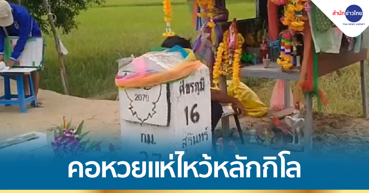 สุรินทร์ 8 พ.ย. – คอหวยแห่กราบไหว้ขอเลขหลักกิโลเมตรที่ 27 ถนนสายศีขรภูมิ-รัตนบุรี บ้านหนองจอก ต.คาละแมะ อ.ศีขรภูมิ จ.สุรินทร์ หลังมีผู้โชคดีถูกหวยติดต่อกันถึง 15 งวด