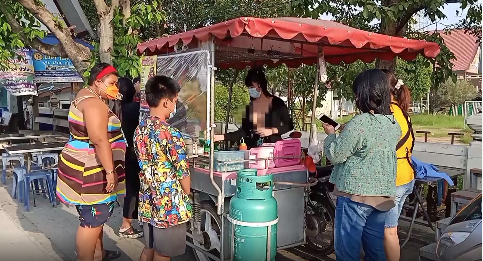 น้องเพชร หรือ นางสาวนภัส เกิดต่อพันธ์ ชาวอำเภอนครชัยศรี เล่าว่าขายที่หน้าวัดมานานกว่า 6 ปีแล้ว ปกติก็เป็นคนแต่งตัวแบบนี้ แต่งตัวเปรี้ยวๆ เวลาว่าง ก็จะออกมาช่วยน้าขาย เมนูที่ได้รับความนิยม ไส้หวาน 10 ชิ้น 20 บาท ไส้เนยนม 10 ชิ้น 20 บาท ไส้กรอก หรือไส้ไข่ 7 ชิ้น 20 บาท รวมมิตรพริกเผา 7 บาท
