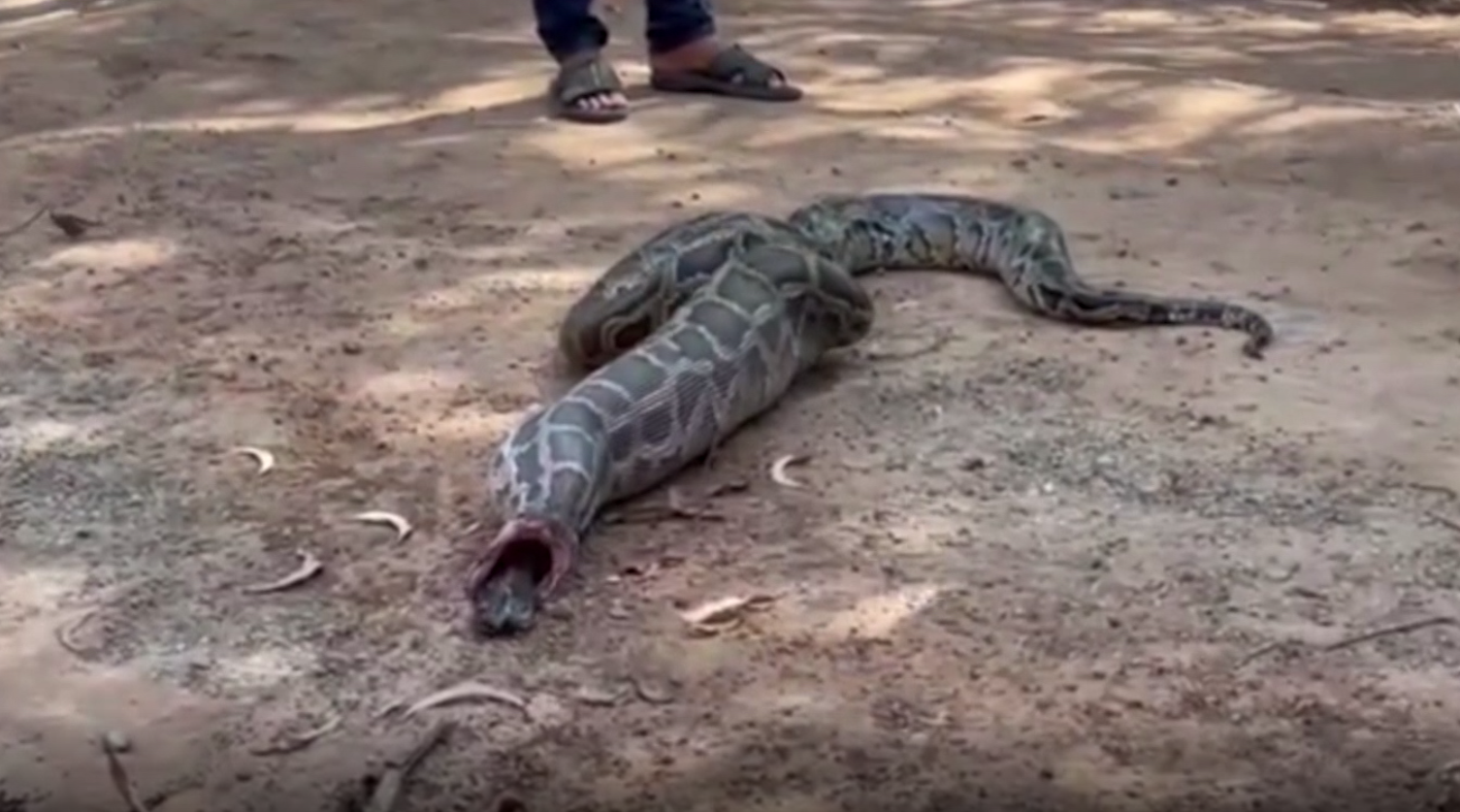 กู้ภัยใช้เวลาพอสมควรพยายามดึงงูออกมาด้วยความระมัดระวัง เพราะลักษณะงูมีนิสัยดุร้าย ขู่ตลอดเวลา พอดึงงูออกมาได้ระหว่างที่จะจับใส่ถุง ปรากฎว่าเจ้างูหลามได้ขย้อนเหยื่อออกมาจากท้อง พบว่าเป็นซากแมว 1 ตัว