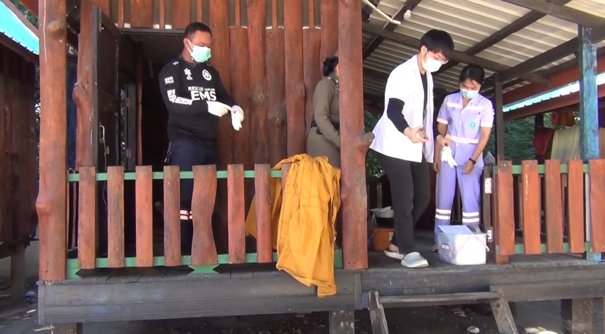 เจ้าหน้าที่ตำรวจ กู้ภัย พร้อมด้วยแพทย์เวรโรงพยาบาลมุกดาหาร เข้าตรวจสอบศพพระสมแปลง กุลพันธ์ หรือ พระตาบ อายุ 56 ปี ที่นอนมรณภาพอยู่ในกุฏิ ลักษณะเป็นบ้านไม้ยกพื้นสูง ตั้งอยู่ภายในวัดห้วยแข้ ชุมชนอนุรักษ์บำรุง เขตเทศบาลเมืองมุกดาหาร