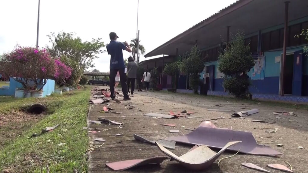 บุรีรัมย์ 3 ก.พ. – พายุหมุนถล่มบุรีรัมย์ พัดบ้านเรือน โรงเรียน และยุ้งข้าวเสียหายกว่า 30 หลัง สังกะสีปลิว ครูโรงเรียนบ้านสระเกษ บอกว่าปีนี้เสียหายหนักสุดในรอบ 30 ปี ขณะรูปปั้นพญานาคบนยอดฉัตรหอระฆังวัด ถูกต้นไม้ขนาดใหญ่หักทับจนเศียรขาด