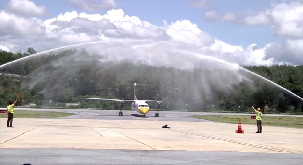 เครื่องบินโดยสารของสายการบินนกแอร์ เที่ยวบิน DD 6260 ซึ่งเป็นเที่ยวบินปฐมฤกษ์ของท่าอากาศยานเบตง เดินทางมาถึงท่าอากาศยานเบตง จ.ยะลา และเข้าสู่อุโมงค์น้ำ ตามธรรมเนียมปฏิบัติการบิน เพื่อเป็นการต้อนรับและเฉลิมฉลองเที่ยวบินปฐมฤกษ์ เมื่อเวลา 12.05 น. วันนี้ (14 มี.ค.) โดยมี พล.อ.ประยุทธ์ จันทร์โอชา นายกรัฐมนตรี พร้อมคณะ รวมทั้งผู้โดยสารของสายการบินเที่ยวบินปฐมฤกษ์ ร่วมเดินทางมาทั้งสิ้น 80 คน ท่ามกลางการต้อนรับอย่างอบอุ่นจากท่าอากาศยานเบตง