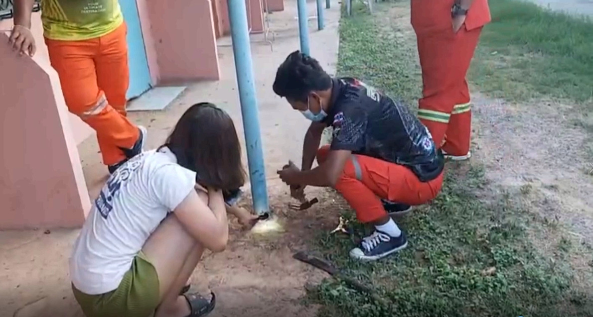 โดย น.ส.นิกา (นามสมมุติ) เป็นพลเมืองดีและผู้แจ้งขอความช่วยเหลือยืนรอพบเจ้าหน้าที่อาสาสมัครกู้ภัยสุรินทร์ ให้ข้อมูลว่าตนพาสุนัขมาเดินเล่นมาถึงจุดเกิดเหตุก็ได้ยินเสียงลูกแมวร้องตลอดเวลา พยายามมองหาและตามหาที่มาของเสียง ได้ยินแต่เสียงร้องแล้วเงียบหายไป จนมีช่วงได้ยินเสียงร้องดังมาก จึงเดินตามหาพบว่าเสียงดังกล่าวอยู่ภายในเสาเหล็กหน้าหอพัก จึงแน่ใจว่าลูกแมวที่ได้ยินเสียงนั้นต้องตกลงไปอยู่ในเสาเหล็กดังกล่าวอย่างแน่นอน จึงแจ้งให้เจ้าหน้าที่กู้ภัยสุรินทร์เร่งให้การช่วยเหลือ