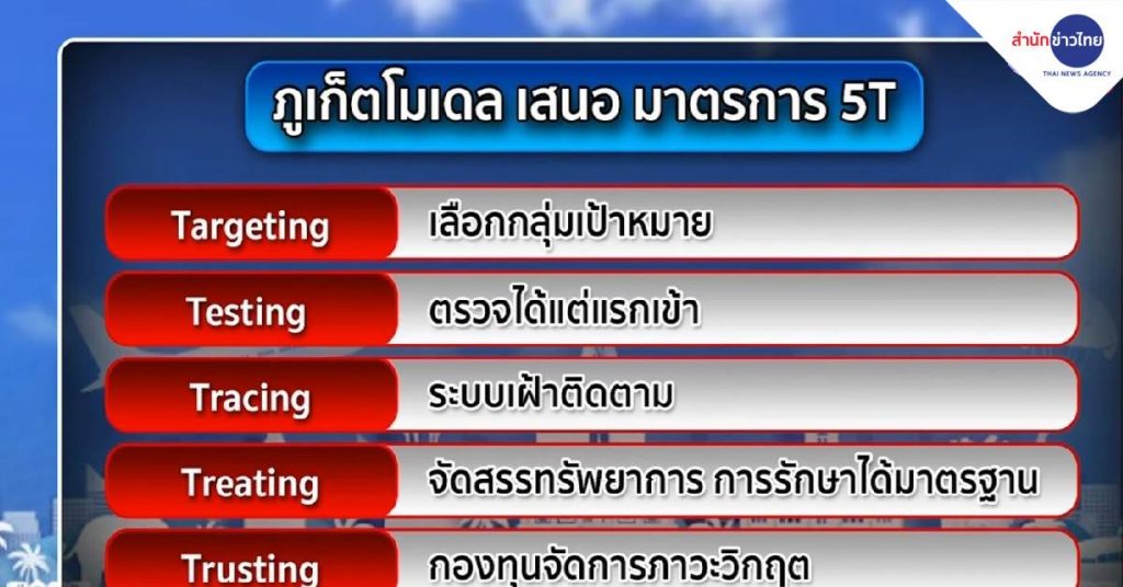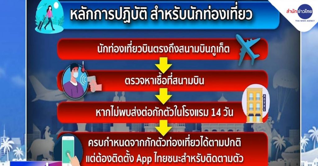 โดยมีข้อแม้ว่า นักท่องเที่ยวต่างชาติที่จะเข้ามาเที่ยวในภูเก็ต ต้องปฏิบัติตามมาตรการ 5T อย่างเคร่งครัด จะต้องได้รับการตรวจหาเชื้อโควิด-19 ทันทีที่เข้าสู่สนามบินภูเก็ต หากพบเชื้อ ก็จะต้องเข้ารับการรักษาตามขั้นตอน แต่หากไม่พบ จะต้องกักตัว 14 วันภายในโรงแรม ที่ผ่านเกณฑ์มาตรฐานที่รัฐกำหนดเท่านั้น ซึ่งจะต้องจองล่วงหน้าไว้ก่อนการเดินทางมายังประเทศไทย เมื่อครบกำหนด 14 วัน จึงจะออกไปท่องเที่ยวยังที่อื่นๆ รวมถึงต่างจังหวัดได้ตามปกติ แต่มีข้อแม้ว่าจะต้องใช้ให้ App ไทยชนะ เพื่อให้ทางการไทยติดตามตัวได้ตลอดระยะเวลา