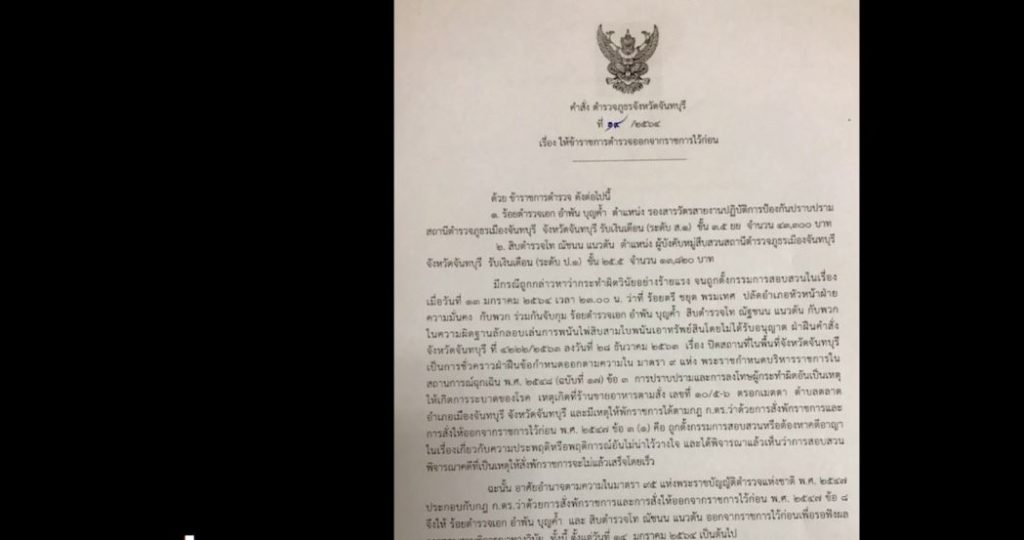 จันทบุรี 14 ม.ค. – เล่นซะเอง สั่งเชือด 2 นายตำรวจ สภ.เมืองจันทบุรี ให้ออกจากราชการ หลังถูกจับลักลอบเล่นพนันไพ่สิบสามใบ