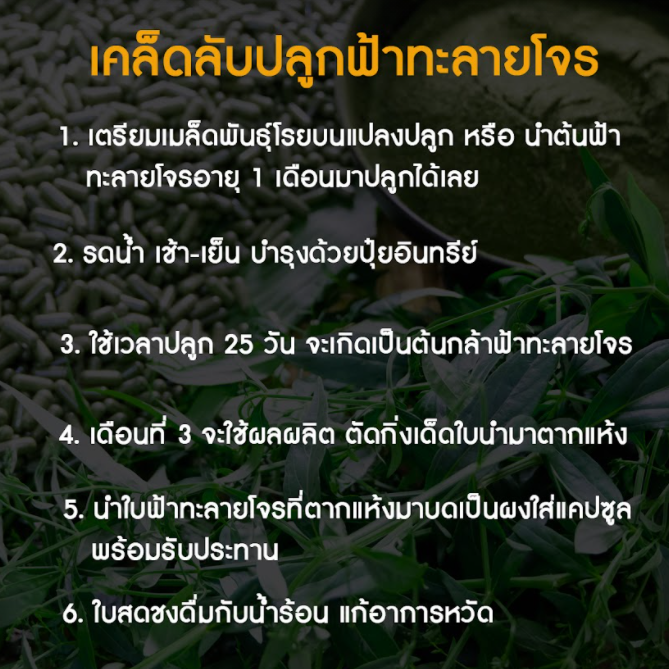 คุณแม่นวลสง่า เนาวงศ์ ประธานวิสาหกิจชุมชนแปรรูปสมุนไพร บ้านดงกลาง อ.พระยืน จ.ขอนแก่น ผู้เชี่ยวชาญด้านการแปรรูปสมุนไพร เผยเคล็ดลับการปลูก “ฟ้าทะลายโจร” ซึ่งมีสรรพคุณใช้บรรเทาอาการไข้หวัด แก้ไอ เจ็บคอ ทางการแพทย์แผนไทย ระบุฟ้าทะลายโจรมีสารแอนโดรกราโฟไลด์ ช่วยยับยั้งการแบ่งตัวของไวรัส ได้ในทุกระยะ ปัจจุบันผู้ป่วยโควิด-19 ใช้เป็นตัวเลือกบรรเทาอาการป่วย ได้รับความนิยมจนขาดตลาด มีกลุ่มผู้ไม่หวังดีฉวยโอกาสผลิตฟ้าทะลายโจรปลอมออกมาจำหน่าย ทีมข่าวสำนักข่าวไทยพาชมวิธีปลูกฟ้าทะลายโจรไว้ใช้บริโภคในครัวเรือน พบวิธีการปลูกไม่ยากเลย