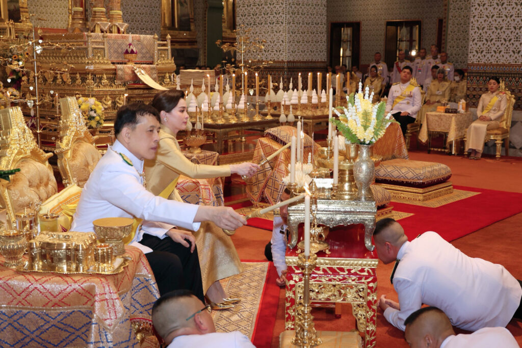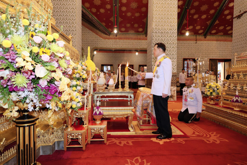 เมื่อเสด็จพระราชดำเนินถึงพระที่นั่งอมรินทรวินิจฉัย พระบาทสมเด็จพระเจ้าอยู่หัว ทรงจุดธูปเทียนเครื่องนมัสการพานทองสองชั้นบูชาพระพุทธปฏิมาชัยวัฒน์ รัชกาลที่ 9 พระพุทธมหาราช ฉ ปริวัตน์ และพระพุทธรูปประจำพระชนมวารของพระบาทสมเด็จพระบรมชนกาธิเบศร มหาภูมิพลอดุลยเดชมหาราช บรมนาถบพิตร พระพุทธรูปประจำพระชนมวารของพระบาทสมเด็จพระปรเมนทรมหาอานันทมหิดล พระอัฐมรามาธิบดินทร พระพุทธรูปประจำพระชนมวารของสมเด็จพระมหิตลาธิเบศร อดุลยเดชวิกรม พระบรมราชชนก พระพุทธรูปประจำพระชนมวารของสมเด็จพระศรีนครินทราบรมราชชนนี และพระพุทธรูปประจำพระชนมวารของสมเด็จพระเจ้าพี่นางเธอ เจ้าฟ้ากัลยาณิวัฒนา กรมหลวงนราธิวาสราชนครินทร์ ที่หน้าพระที่นั่งบุษบกมาลา ทรงกราบ ทรงจุดธูปเทียนเครื่องราชสักการะทองลงยาราชาวดี และทรงจุดธูปเทียนเครื่องทองน้อยกราบถวายบังคมพระบรมอัฐิพระบาทสมเด็จพระบรมชนกาธิเบศร มหาภูมิพลอดุลยเดชมหาราช บรมนาถบพิตร พระบาทสมเด็จพระปรเมนทรมหาอานันทมหิดล พระอัฐมรามาธิบดินทร และพระอัฐิสมเด็จพระมหิตลาธิเบศร อดุลยเดชวิกรม พระบรมราชชนก สมเด็จพระศรีนครินทราบรมราชชนนี และสมเด็จพระเจ้าพี่นางเธอ เจ้าฟ้ากัลยาณิวัฒนา กรมหลวงนราธิวาสราชนครินทร์ ซึ่งประดิษฐานที่พระแท่นพระนพปฎลมหาเศวตฉัตร สมเด็จพระนางเจ้า ฯ พระบรมราชินี ทรงจุดธูปเทียนเครื่องราชสักการะทองลงยารอง และทรงจุดธูปเทียนเครื่องทองน้อย