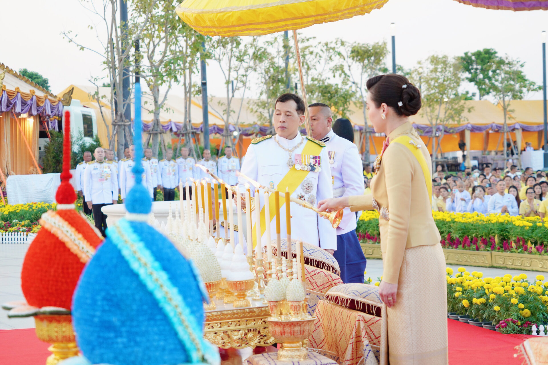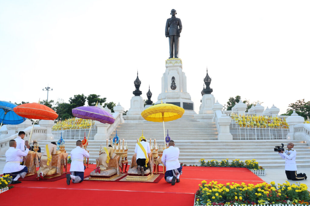 เมื่อเสด็จพระราชดำเนินถึงพระบรมราชานุสาวรีย์พระบาทสมเด็จพระบรมชนกาธิเบศร มหาภูมิพลอดุลยเดชมหาราช บรมนาถบพิตร พระบาทสมเด็จพระเจ้าอยู่หัว ทรงวางพุ่มดอกไม้ สมเด็จพระนางเจ้า ฯ พระบรมราชินี ทรงวางพุ่มดอกไม้ของสมเด็จพระนางเจ้าสิริกิติ์ พระบรมราชินีนาถ พระบรมราชชนนีพันปีหลวง และทรงวางพุ่มดอกไม้ส่วนพระองค์ เสร็จแล้ว พระบาทสมเด็จพระเจ้าอยู่หัว และสมเด็จพระนางเจ้า ฯ พระบรมราชินี ทรงจุดธูปเทียนเครื่องราชสักการะทองทิศ และทรงจุดธูปเทียนเครื่องทองน้อยถวายราชสักการะ ทรงกราบ สมเด็จพระเจ้าลูกเธอ เจ้าฟ้าสิริวัณณวรี นารีรัตนราชกัญญา และสมเด็จพระเจ้าลูกยาเธอ เจ้าฟ้าทีปังกรรัศมีโชติ มหาวชิโรตตมางกูร ทรงวางพุ่มดอกไม้ ทรงจุดธูปเทียนเครื่องทองน้อยถวายราชสักการะ ทรงกราบ