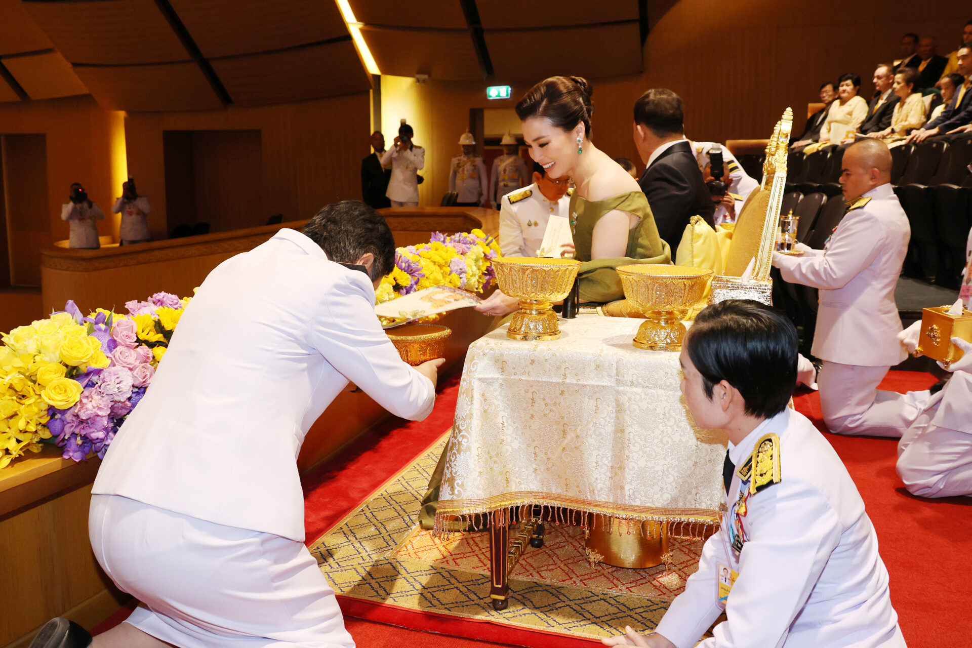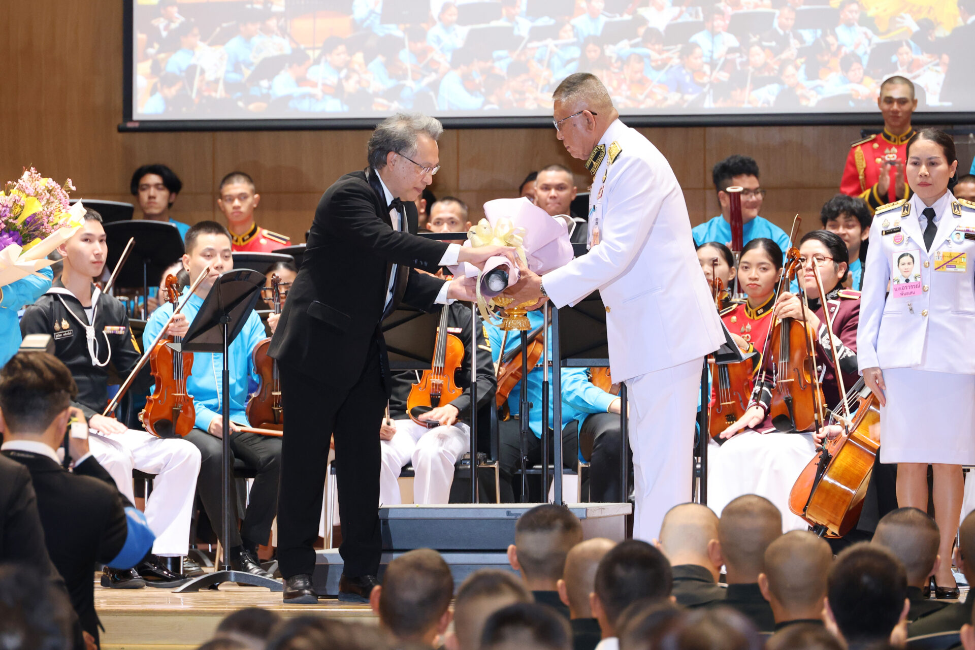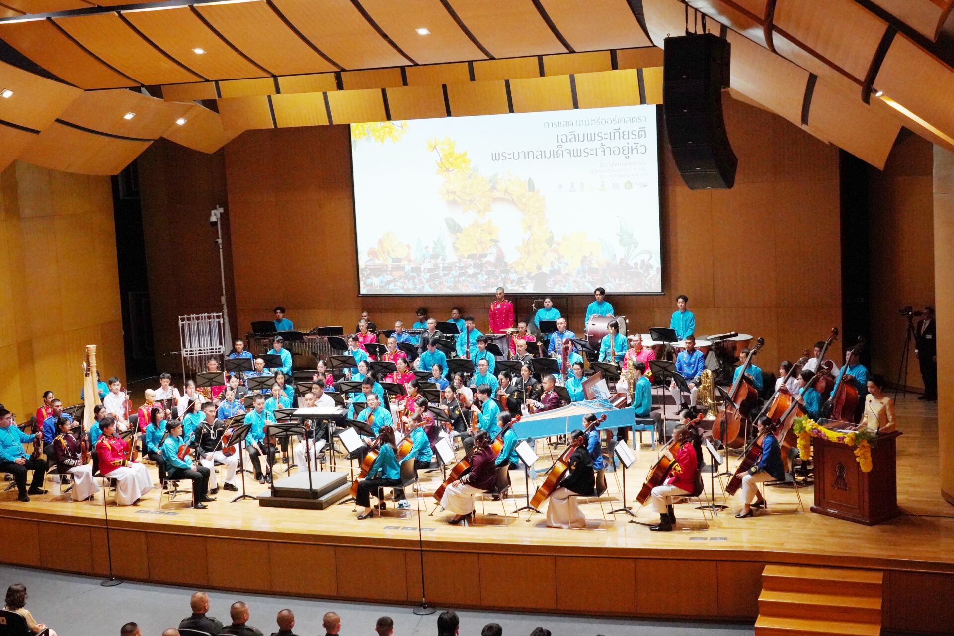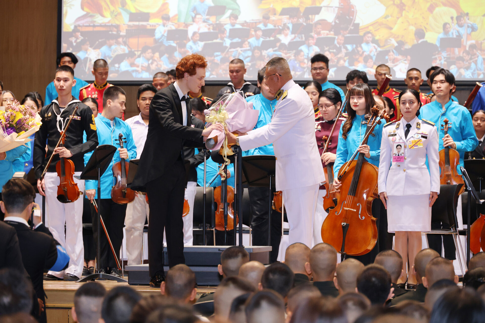 ภายหลังจบการแสดง พระบาทสมเด็จพระเจ้าอยู่หัว ทรงพระกรุณาโปรดเกล้าโปรดกระหม่อมให้ พลอากาศโท ภักดี แสง-ชูโต ผู้ช่วยราชเลขานุการในพระองค์พระบาทสมเด็จพระเจ้าอยู่หัว เชิญช่อดอกไม้พระราชทานมอบแก่หัวหน้าวงดุริยางค์ซิมโฟนีออร์เคสตรา ผู้แทนนักดนตรี ผู้ประพันธ์บทเพลง และวาทยากร สมควรแก่เวลา จึงประทับรถยนต์พระที่นั่ง เสด็จพระราชดำเนินกลับ.-211-สำนักข่าวไทย