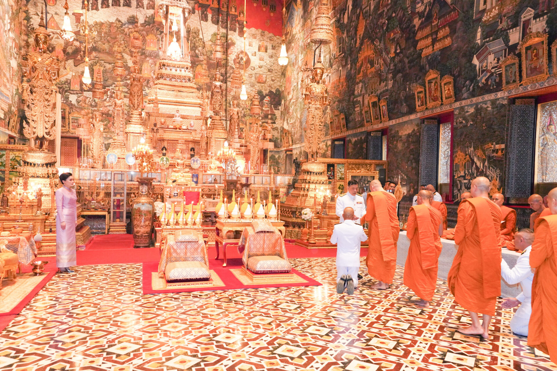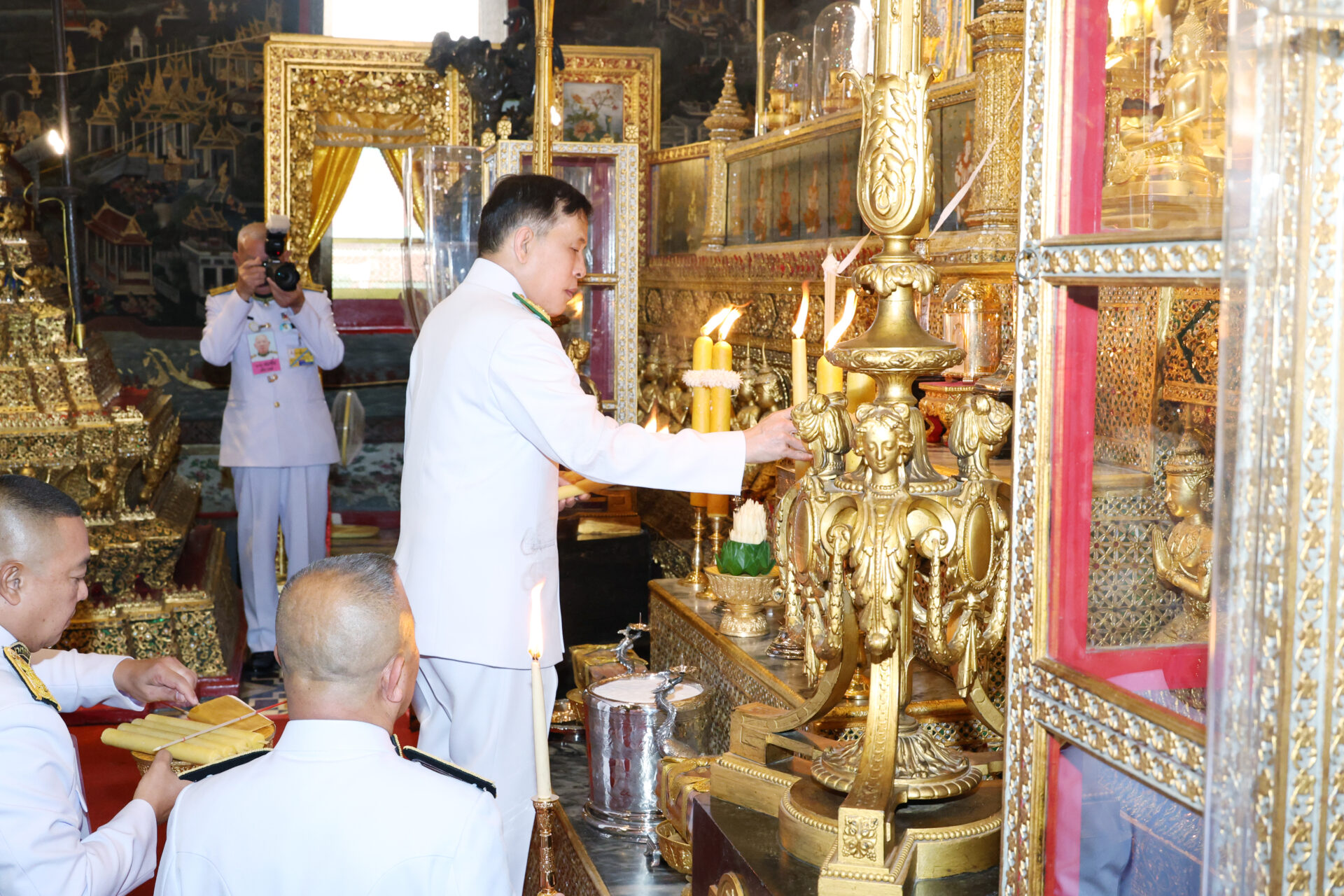 เมื่อเสด็จเข้าพระอุโบสถวัดพระศรีรัตนศาสดาราม พระบาทสมเด็จพระเจ้าอยู่หัว ทรงจุดเทียนรุ่ง ทรงวางกระทงดอกไม้บนพานหน้าฐานชุกชี ทรงจุดธูปเทียนเครื่องนมัสการท้ายที่นั่ง แล้วทรงจุดเทียนห่วงบูชาพระพุทธมหามณีรัตนปฏิมากร ต่อจากนั้น ทรงจุดธูปเทียนเครื่องนมัสการท้ายที่นั่งบูชาพระพุทธยอดฟ้าจุฬาโลกย์ และพระพุทธเลิศหล้านภาไลย ทรงจุดธูปเทียนเครื่องนมัสการทองใหญ่ที่หน้าธรรมาสน์ศิลา ทรงกราบ สมเด็จพระนางเจ้า ฯ พระบรมราชินี ทรงจุดธูปเทียนเครื่องนมัสการทองทิศที่หน้าธรรมาสน์ศิลา ทรงกราบ