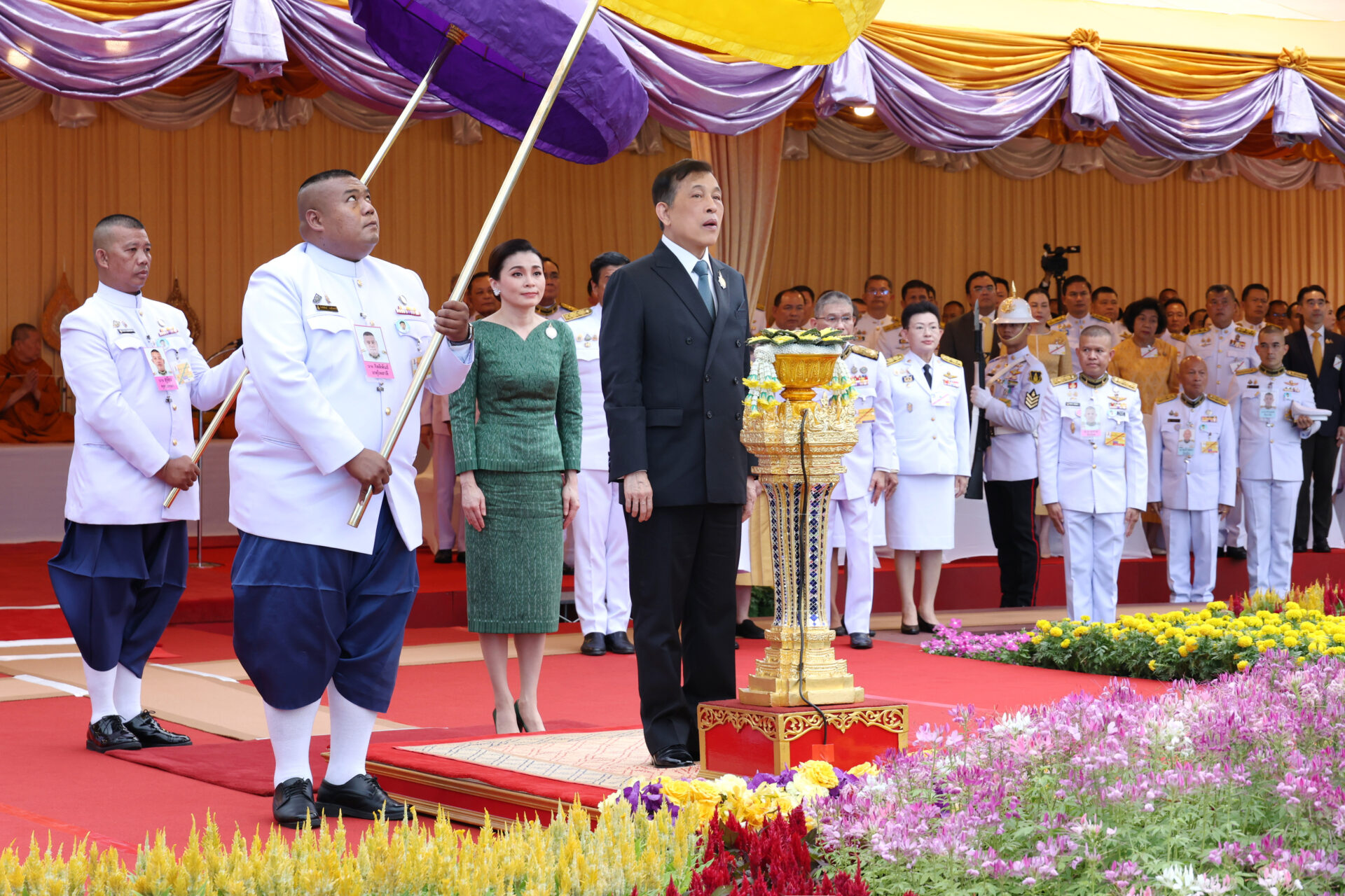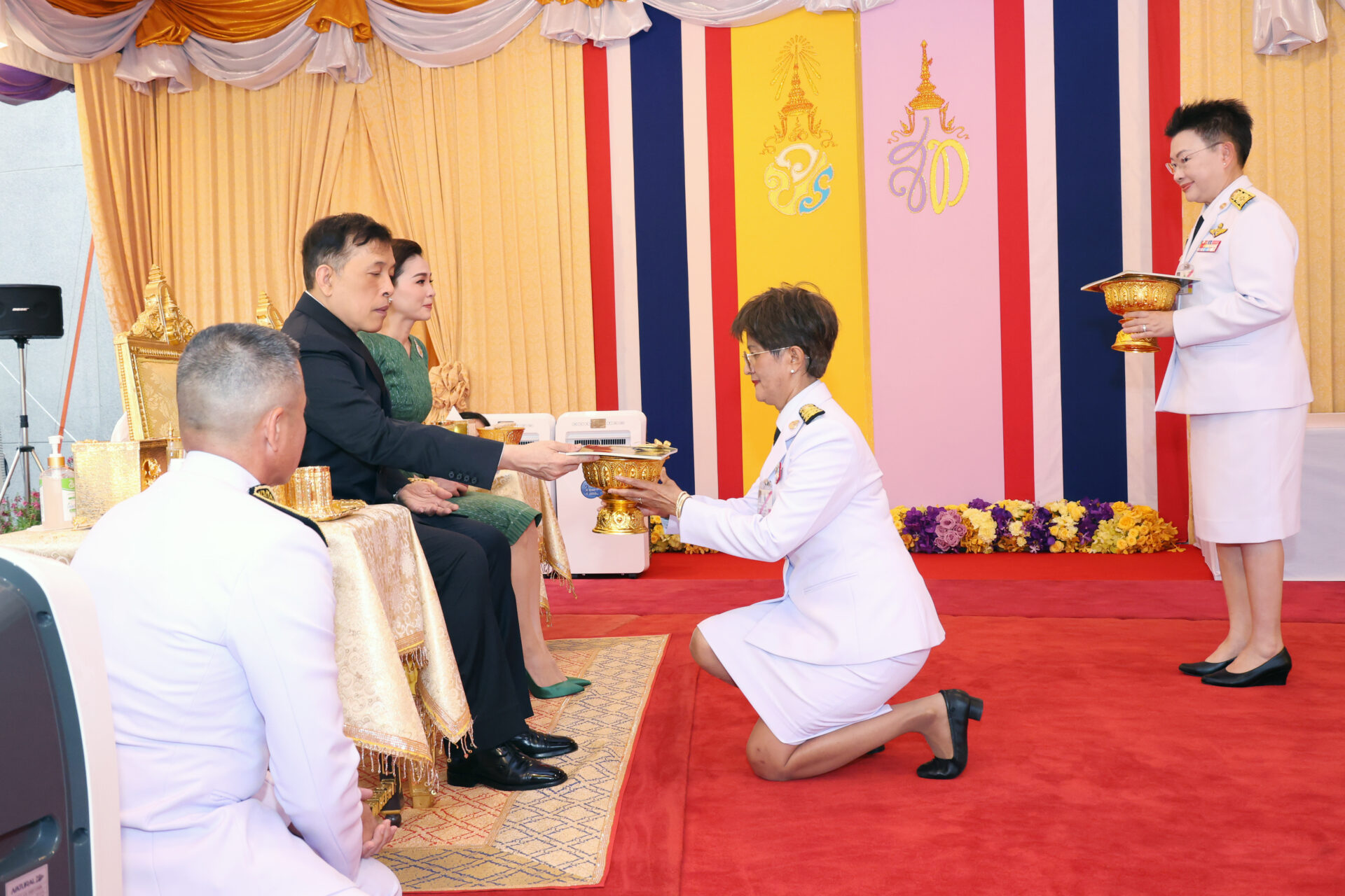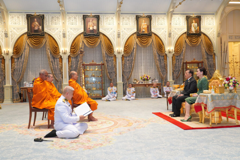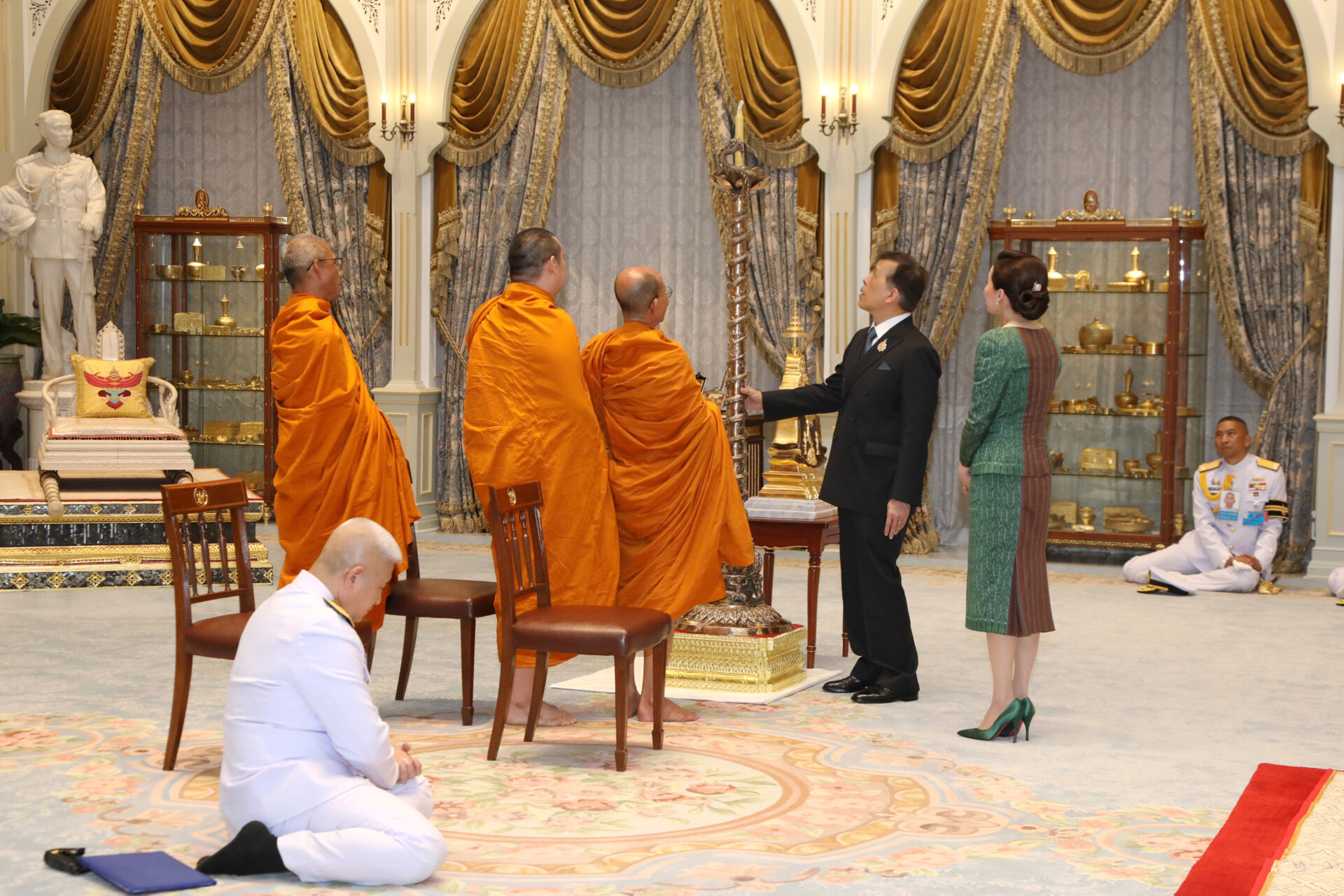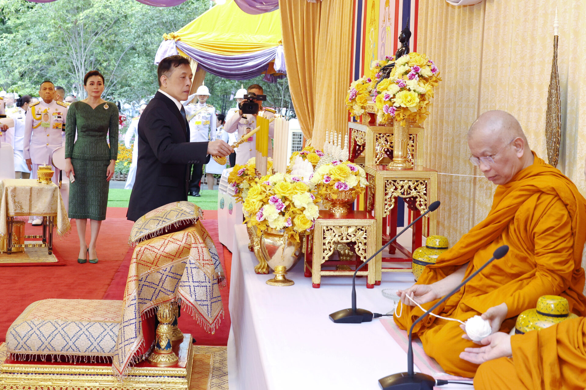 ต่อมาเวลา 18 นาฬิกา 59 นาที พระบาทสมเด็จพระเจ้าอยู่หัว และสมเด็จพระนางเจ้า ฯ พระบรมราชินี เสด็จออก ณ พระที่นั่งอัมพรสถาน พระราชวังดุสิต พระราชทานพระบรมราชวโรกาสให้ พระพรหมวชิรากร (สุนทร สุนฺทราโภ) เจ้าอาวาสวัดราชผาติการาม พร้อมด้วย พระครูวิจิตรสีลาภรณ์ (ปราณี สุปภาโต) เจ้าอาวาสวัดป่าสิริวัฒนวิสุทธิ์ ในสมเด็จพระเจ้าพี่นางเธอ เจ้าฟ้ากัลยาณิวัฒนา กรมหลวงนราธิวาสราชนครินทร์ จังหวัดนครสวรรค์ และพระสงฆ์ เฝ้า ถวายเสาเทียนชัยมงคลเนื้อทองสัมฤทธิ์ พร้อมฐานรองรับซึ่งทำจากไม้มงคล 3 ชนิด ได้แก่ ไม้สักทอง ไม้พะยูง และไม้ขนุน แกะสลักลายไทยปิดทองคำเปลว เพื่อใช้บรรจุเทียนชัยมงคลสำหรับจุดถวายพระพร พระบาทสมเด็จพระเจ้าอยู่หัว และถวายพระแผนที่ประเทศไทย เนื่องในโอกาสพระราชพิธีมหามงคลเฉลิมพระชนมพรรษา 6 รอบ 28 กรกฎาคม 2567 เพื่อพระราชทานแก่วัดและเทวสถาน ตามพระราชอัธยาศัย