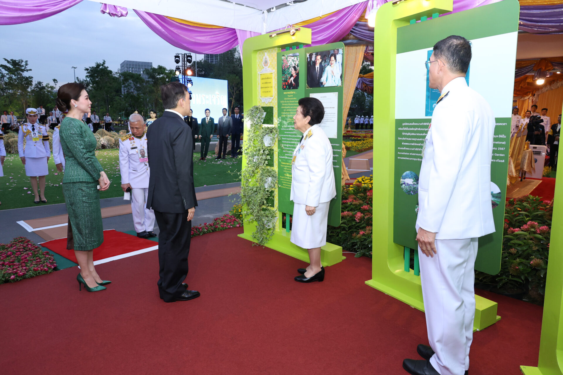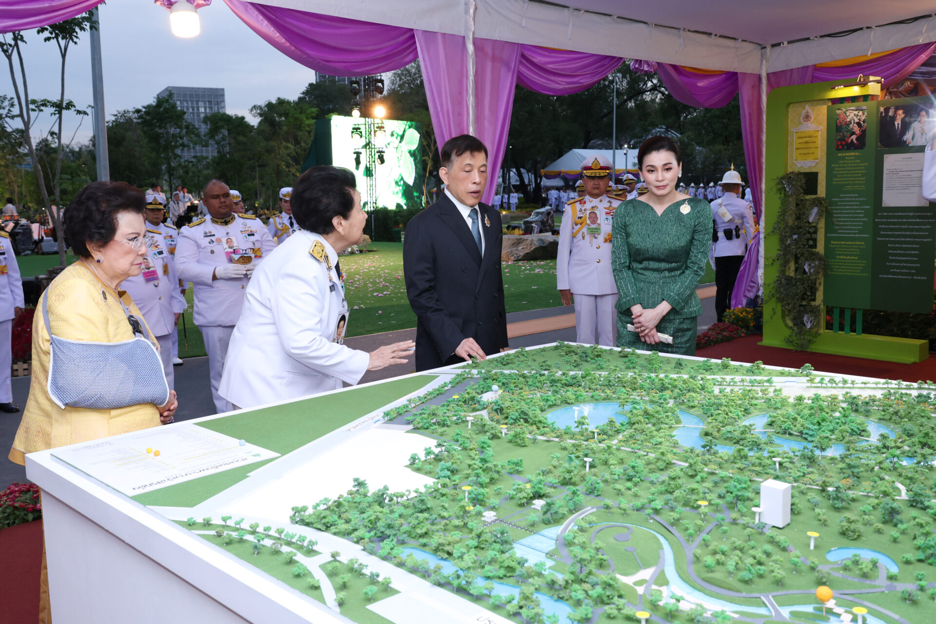 จากนั้น ทอดพระเนตรแบบจำลองและนิทรรศการสวนสมเด็จพระนางเจ้าสิริกิติ์ฯ สวนพฤกษศาสตร์สากล มาตรฐาน BGCI และสวนจากภูผาสู่มหานที ซึ่งสวนสมเด็จพระนางเจ้าสิริกิติ์ฯ คณะรัฐมนตรีได้น้อมเกล้าน้อมกระหม่อมถวายพื้นที่ จำนวน 200 ไร่ แด่สมเด็จพระนางเจ้าสิริกิติ์ พระบรมราชินีนาถ พระบรมราชชนนีพันปีหลวง เนื่องในโอกาสมหามงคลเฉลิมพระชนมพรรษา 5 รอบ 12 สิงหาคม 2535 พระบาทสมเด็จพระเจ้าอยู่หัว มีพระราชปณิธานในการสืบสาน รักษา ต่อยอดพระราโชบายของสมเด็จพระนางเจ้าสิริกิติ์ พระบรมราชินีนาถ พระบรมราชชนนีพันปีหลวง ที่มีรูปแบบการจัดสวนเป็นไปตามหลักระบบนิเวศ และความหลากหลายของพืชพรรณ เช่นเดียวกับผืนป่าในธรรมชาติ ให้เป็น “ป่าเล็กในเมืองใหญ่” ที่สมบูรณ์ สวนสมเด็จพระนางเจ้าสิริกิติ์ฯ จึงมีลักษณะเป็นสวนป่า สวนดอกไม้สวยงาม ร่มรื่น เป็นสถานที่พักผ่อน เป็นปอดให้กับคนกรุงเทพมหานคร รวมทั้ง เป็นแหล่งเรียนรู้และศึกษาวิจัยพรรณไม้ สำหรับเด็ก เยาวชน และประชาชนทั่วไป เพื่อเป็นการปลูกฝังให้ทุกคนช่วยกันรักษาระบบนิเวศ และอนุรักษ์ทรัพยากรธรรมชาติและสิ่งแวดล้อมต่อไป จึงทรงพระกรุณาโปรดเกล้าโปรดกระหม่อมให้แต่งตั้ง คณะกรรมการมูลนิธิสวนสมเด็จพระนางเจ้าสิริกิติ์ฯ ให้พัฒนาและดูแลรักษาสวนแห่งนี้ ให้เกิดประโยชน์สูงสุด