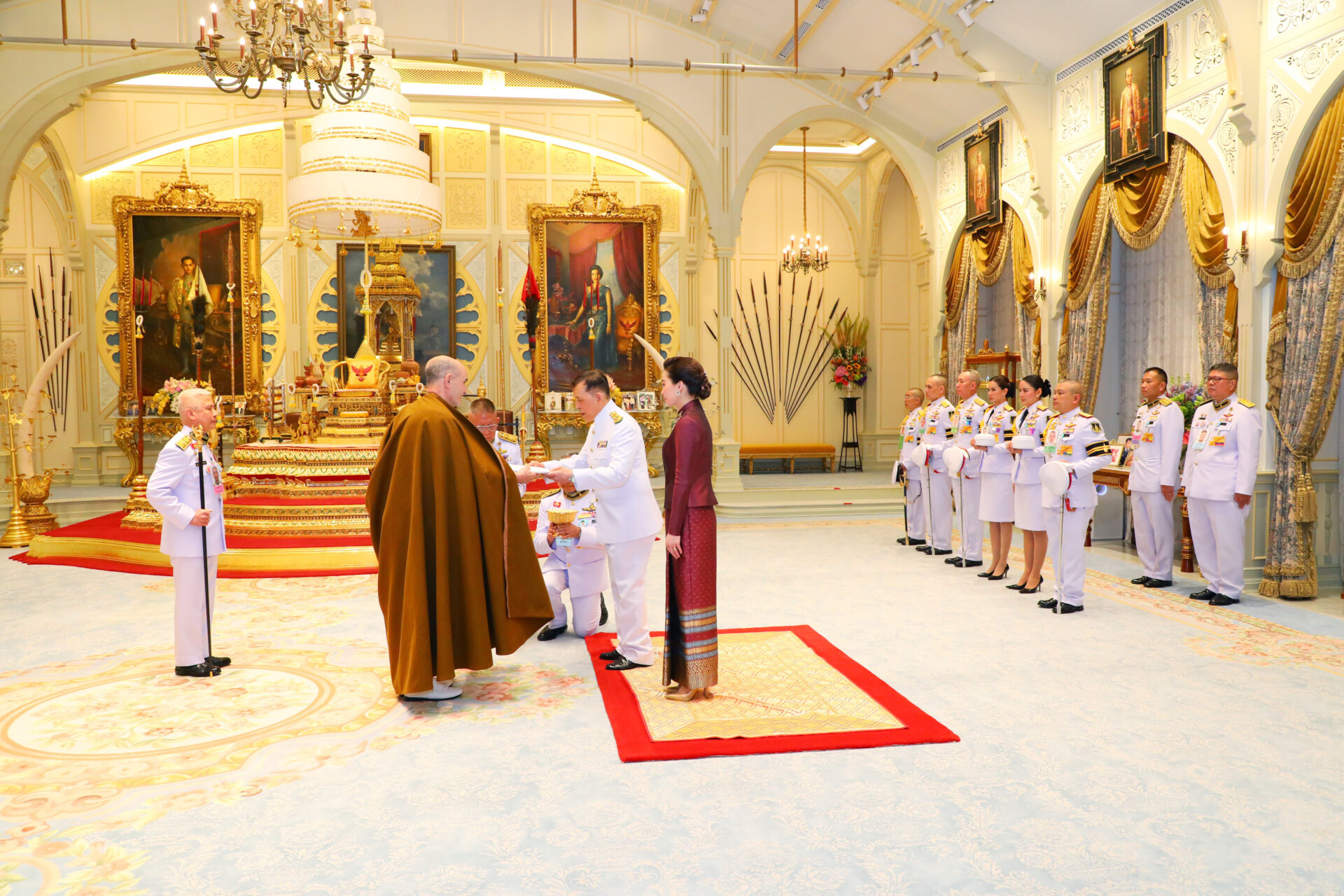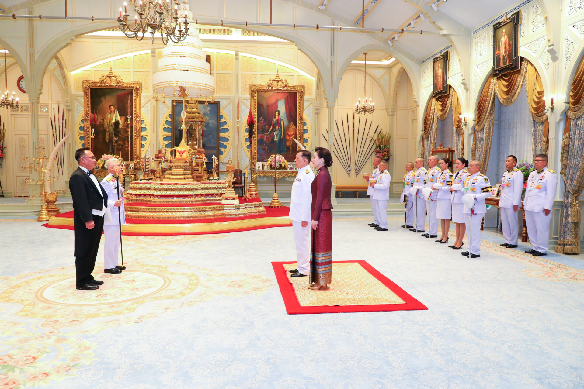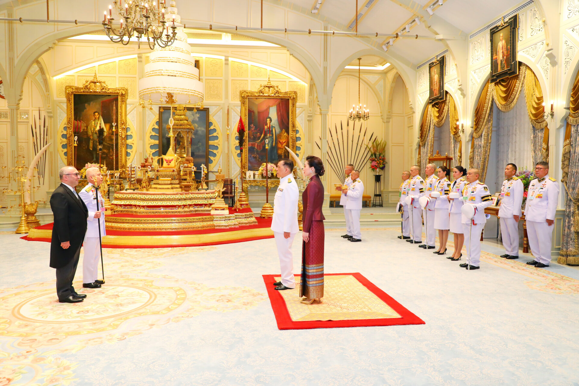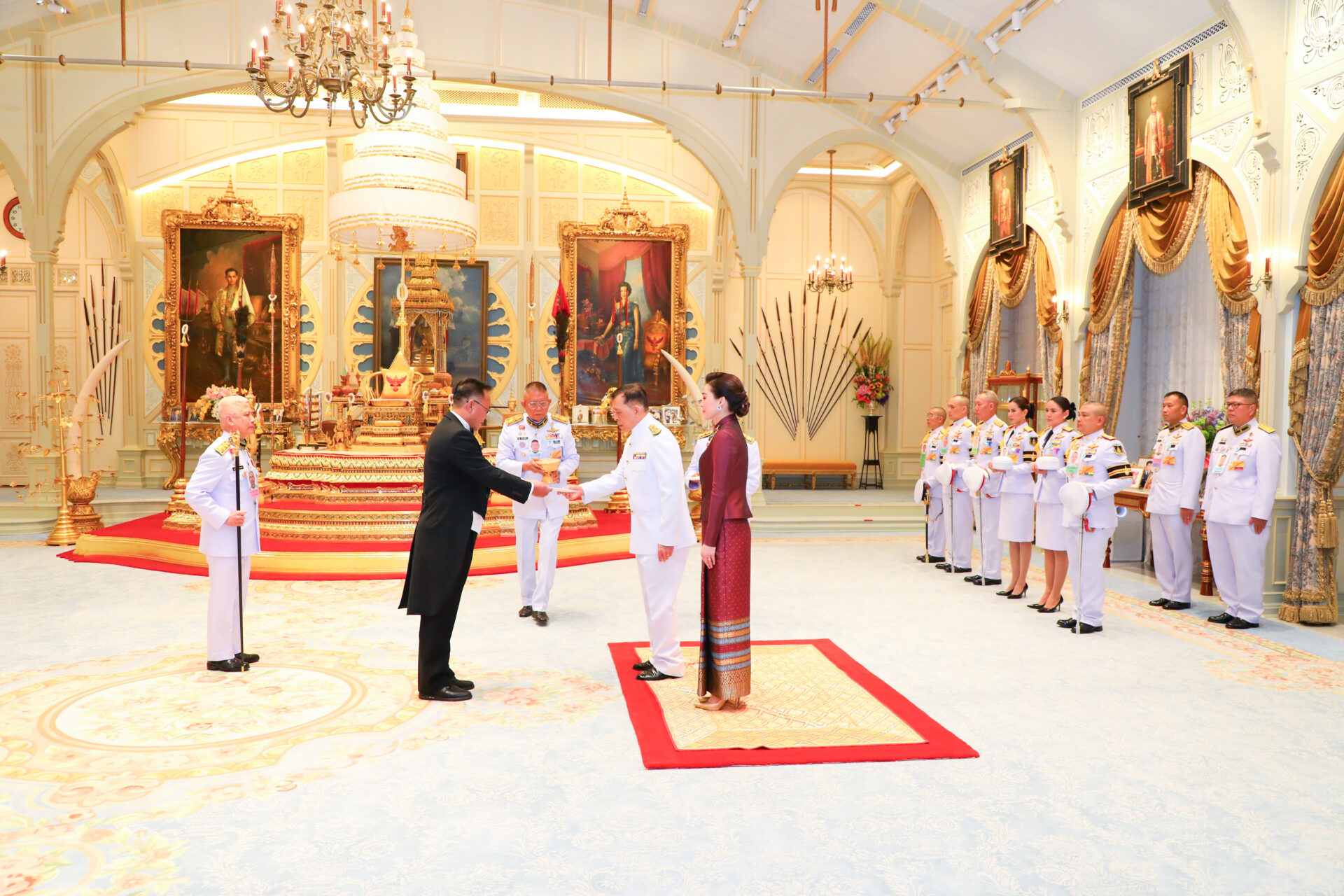 ต่อมา เวลา 18.21 น. พระบาทสมเด็จพระเจ้าอยู่หัว และสมเด็จพระนางเจ้า ฯ พระบรมราชินี เสด็จออก ณ พระที่นั่งอัมพรสถาน พระราชวังดุสิต พระราชทานพระบรมราชวโรกาสให้ เอกอัครราชทูตต่างประเทศประจำประเทศไทย เฝ้าทูลละอองธุลีพระบาท ถวายอักษรสาส์นตราตั้ง ตามลำดับดังนี้