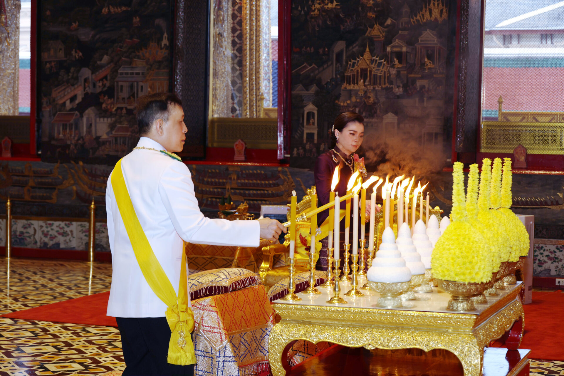 จากนั้น พระราชดำเนินไปพระอุโบสถ วัดพระศรีรัตนศาสดาราม ในพระบรมมหาราชวัง โอกาสนี้ ทรงรับกระทงดอกไม้จากเจ้าพนักงานพระราชพิธีวางบนพานหน้าฐานชุกชี ทรงจุดธูปเทียนเครื่องนมัสการท้ายที่นั่ง แล้วทรงจุดเทียนห่วงบูชา พระพุทธมหามณีรัตนปฏิมากร จากนั้น ทรงจุดธูปเทียนเครื่องนมัสการท้ายที่นั่งบูชา พระพุทธยอดฟ้าจุฬาโลกย์ และพระพุทธเลิศหล้านภาไลย พระบาทสมเด็จพระเจ้าอยู่หัว ทรงจุดธูปเทียนเครื่องนมัสการทองใหญ่ที่หน้าธรรมาสน์ศิลา สมเด็จพระนางเจ้า ฯ พระบรมราชินี ทรงจุดธูปเทียนเครื่องนมัสการทองทิศที่หน้าธรรมาสน์ศิลา
