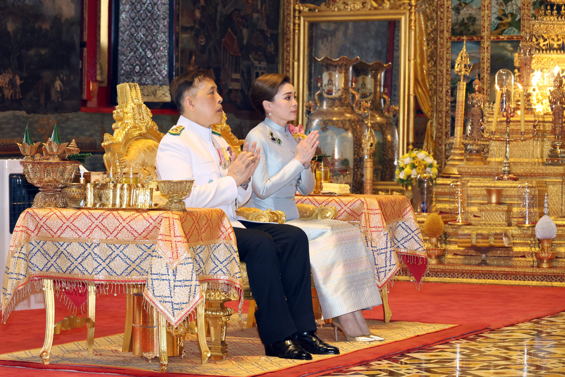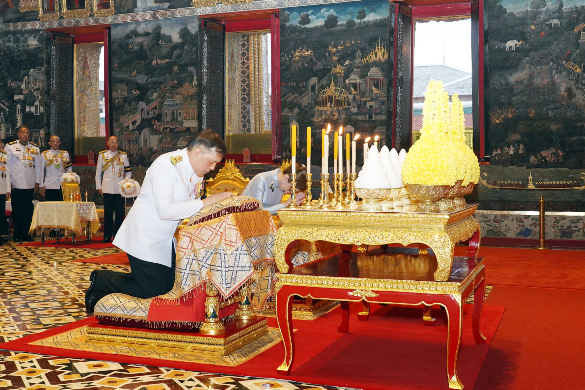 โอกาสนี้ ทรงรับกระทงดอกไม้จากเจ้าพนักงานพระราชพิธี แล้วทรงวางบนพานหน้าฐานชุกชี ทรงจุดธูปเทียนเครื่องนมัสการท้ายที่นั่ง ทรงจุดเทียนห่วงบูชาพระพุทธมหามณีรัตนปฏิมากร จากนั้น ทรงจุดธูปเทียนเครื่องนมัสการท้ายที่นั่งบูชาพระพุทธยอดฟ้าจุฬาโลกย์ และพระพุทธเลิศหล้านภาไลย เสร็จแล้ว พระบาทสมเด็จพระเจ้าอยู่หัว ทรงจุดธูปเทียนเครื่องนมัสการทองใหญ่ที่หน้าธรรมาสน์ศิลา สมเด็จพระนางเจ้า ฯ พระบรมราชินี ทรงจุดธูปเทียนเครื่องนมัสการทองทิศที่หน้าธรรมาสน์ศิลา ทรงศีล เมื่อพระราชวชิรโมลี ผู้ช่วยเจ้าอาวาสวัดระฆังโฆสิตาราม ประธานสงฆ์ถวายศีล จบ เสด็จพระราชดำเนินไปที่ธรรมาสน์ศิลา ทรงพระสุหร่ายสรงพระพุทธปฏิมาชัยวัฒน์ รัชกาลที่ 9, พระคันธารราษฎร์องค์ใหญ่ รัชกาลที่ 10, พระคันธารราษฎร์จีนนั่ง รัชกาลที่ 10, พระคันธารราษฎร์จีนยืน รัชกาลที่ 10, พระคันธารราษฎร์บันได รัชกาลที่ 10, พระคันธารราษฎร์รวงข้าว รัชกาลที่ 10, พระบัวเข็ม, พระพลเทพ, พระโคศุภราช และทรงประพรมพืชต่าง ๆ ซึ่งตั้งอยู่บนโต๊ะ 2 ข้างนั้นด้วย แล้วทรงโปรยดอกไม้และถวายพวงมาลัยที่พระพุทธรูปทุกองค์