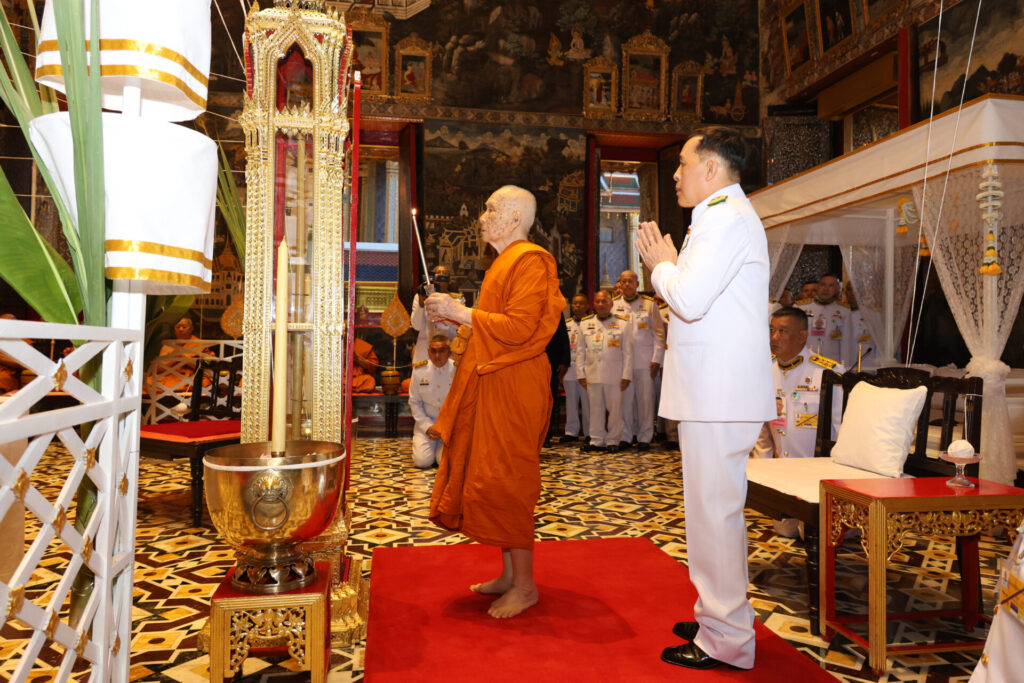 จากนั้น เสด็จพระราชดำเนินไปที่ธรรมาสน์ศิลา ทรงเจิมเทียนพระมหามงคลทอง เงิน เทียนวิปัสสี ทรงจุดไฟจากโคมไฟฟ้าจุดเทียนพระมหามงคลทอง เงิน เทียนวิปัสสี และเทียนนวหรคุณ ทรงคม จากนั้น เสด็จพระราชดำเนินไปทรงพระสุหร่าย และทรงโปรยดอกมะลิ “เหรียญพระบรมรูปพระบาทสมเด็จพระเจ้าอยู่หัว เนื่องในโอกาสพระราชพิธีมหามงคลเฉลิมพระชนมพรรษา ๖ รอบ ๒๘ กรกฎาคม ๒๕๖๗” เสร็จแล้ว ทรงประเคนจตุปัจจัยไทยธรรมแด่สมเด็จพระอริยวงศาคตญาณ สมเด็จพระสังฆราช สกลมหาสังฆปริณายก และพระสงฆ์ที่เจริญพระพุทธมนต์ ๑๐ รูป และพระสงฆ์ที่นั่งปรก ๕ รูป ทรงหลั่งทักษิโณทก พระสงฆ์ถวายอนุโมทนา ถวายอดิเรก พระบาทสมเด็จพระเจ้าอยู่หัว และสมเด็จพระนางเจ้า ฯ พระบรมราชินี ทรงกราบที่หน้าธรรมาสน์ศิลา ทรงจุดเทียนทอง เทียนเงิน และธูปเทียนเครื่องบูชากระบะมุกหน้าสวดภาณวาร แล้วทรงจุดเทียนพุทธาภิเษกที่ขันสาครข้างตู้เทียนชัยซ้ายและขวา