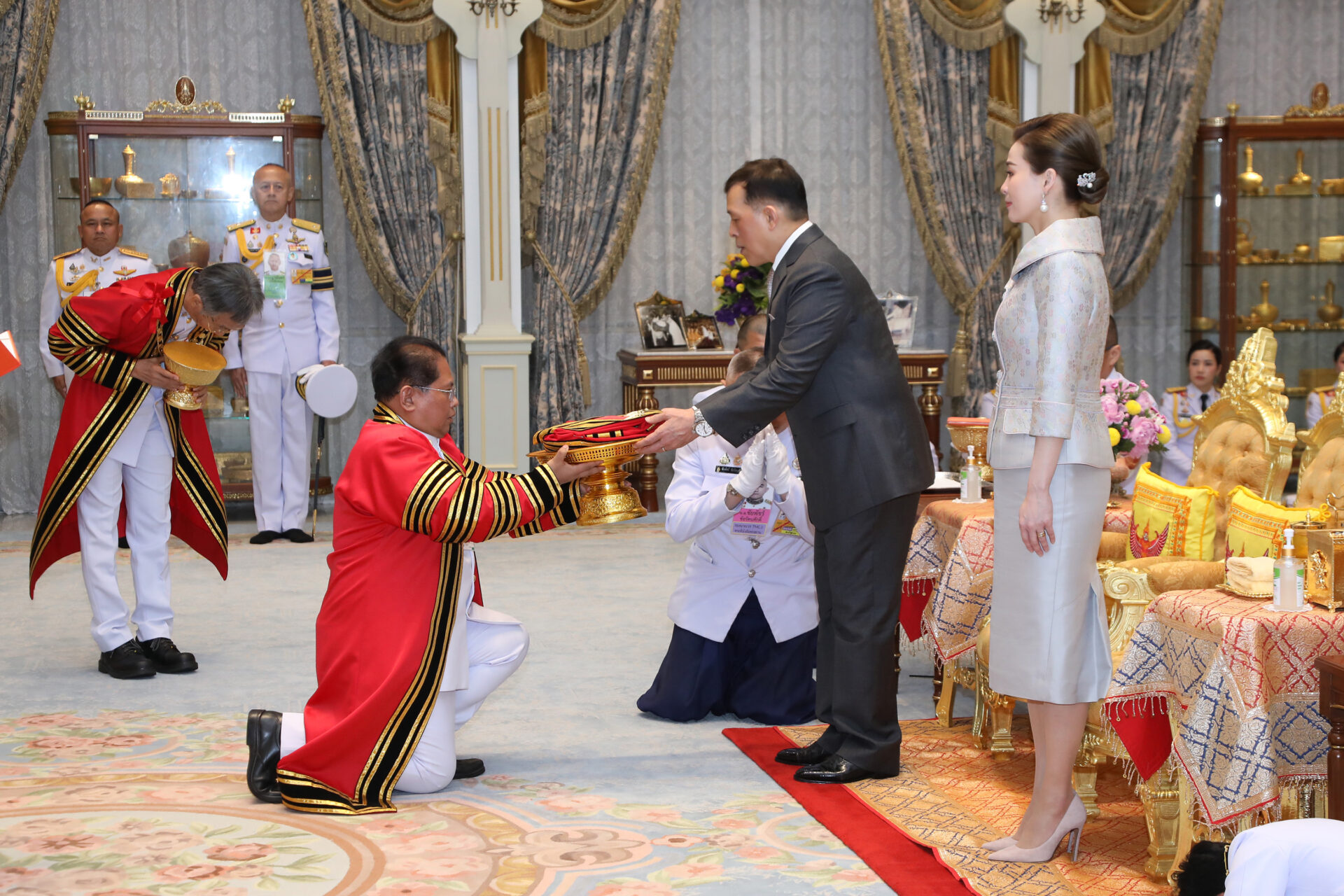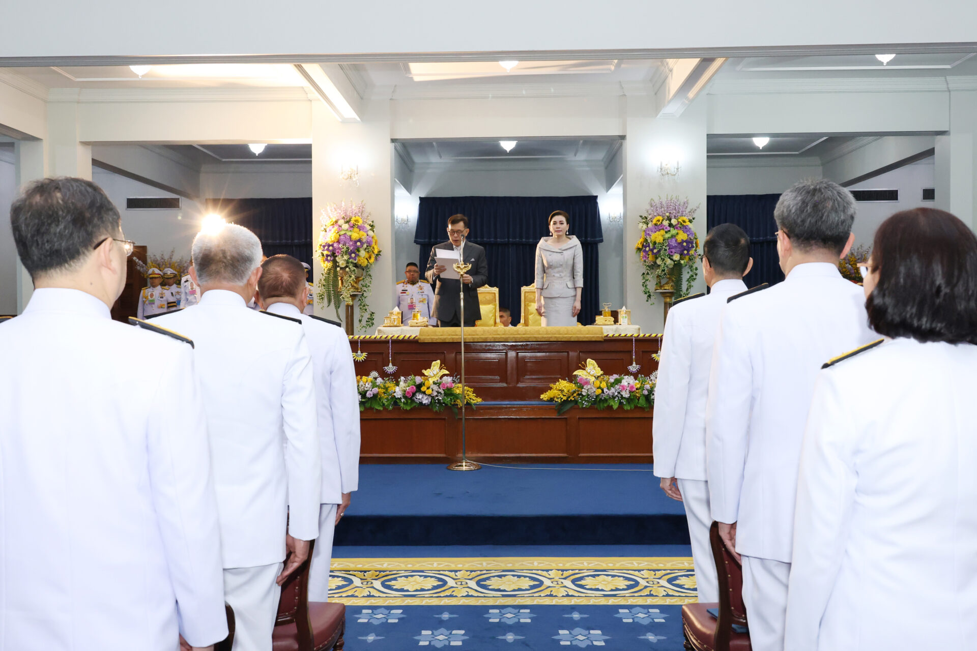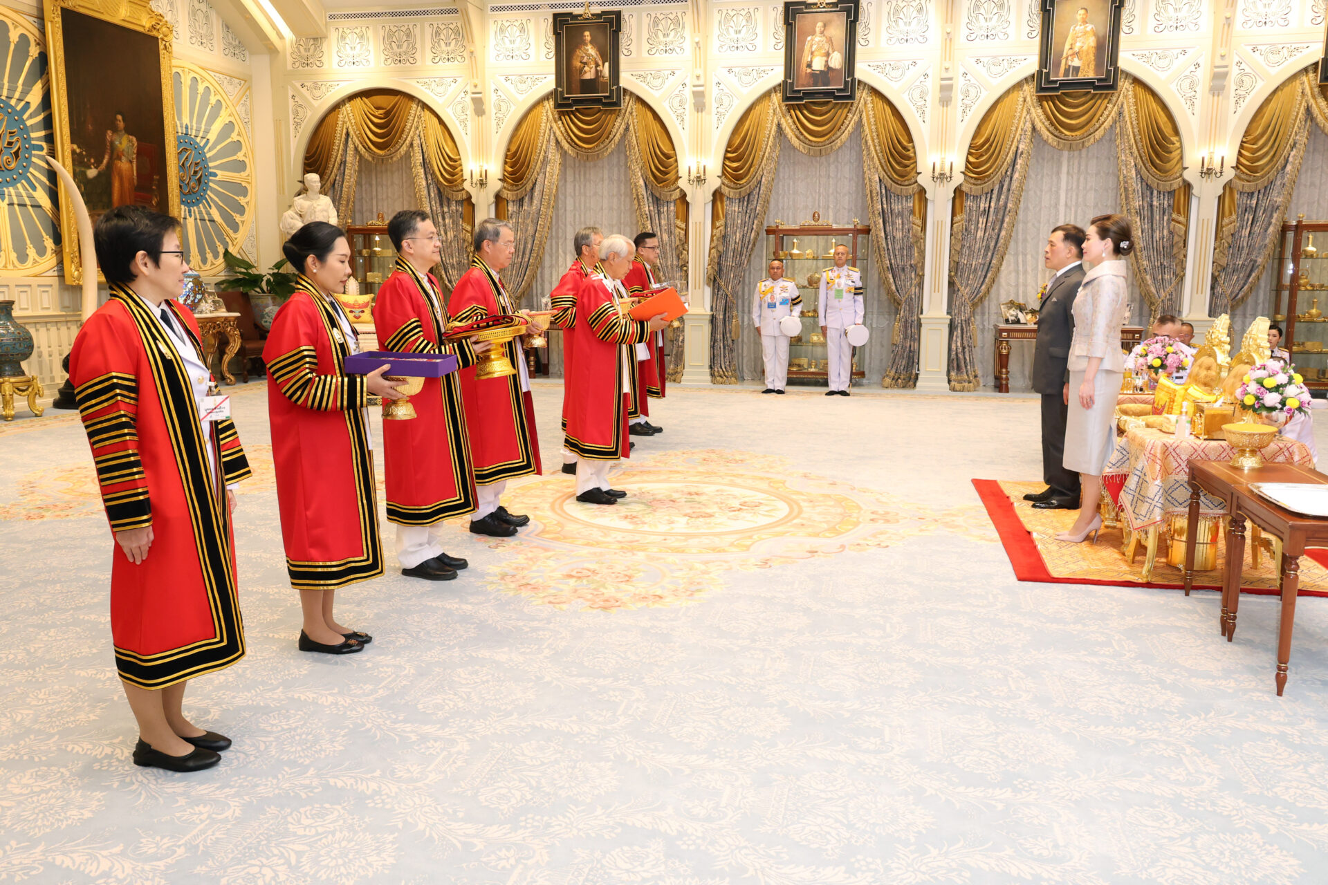 ต่อมา เวลา 18.54 น. พระบาทสมเด็จพระเจ้าอยู่หัว และสมเด็จพระนางเจ้า ฯ พระบรมราชินี เสด็จออก ณ พระที่นั่งอัมพรสถาน พระราชวังดุสิต พระราชทานพระบรมราชวโรกาสให้ คณะบุคคลต่าง ๆ เฝ้าทูลละอองธุลีพระบาท ดังนี้