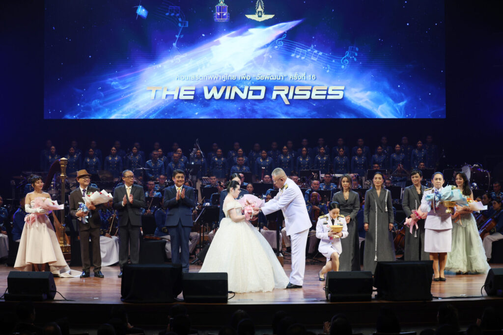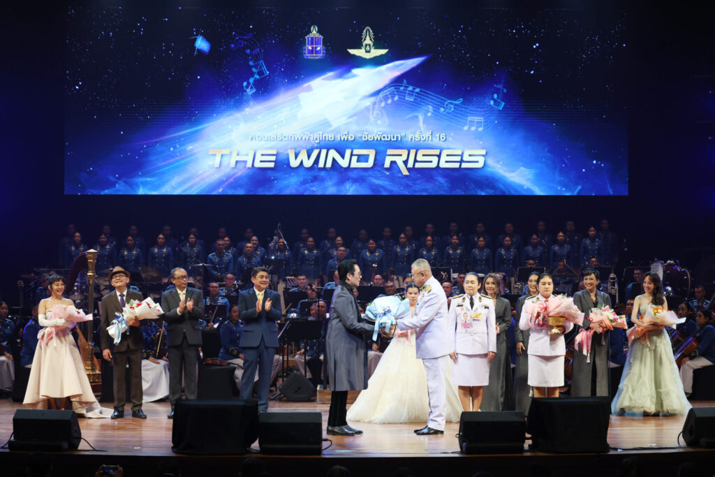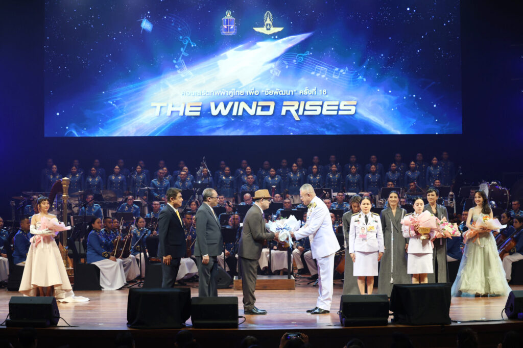 จากนั้น ทอดพระเนตรการแสดงคอนเสิร์ตทัพฟ้าคู่ไทยเพื่อ “ชัยพัฒนา” ครั้งที่ 16 กองทัพอากาศจัดขึ้น ภายใต้แนวคิด The Wind rises “ปีกแห่งฝัน วันแห่งรัก” สื่อความหมายถึงความแข็งแกร่งและมีประสิทธิภาพ แต่เต็มไปด้วยความอ่อนโยน เปรียบเสมือนบริบทของความท้าทายหรือกระแสลมที่กองทัพอากาศต้องเผชิญ ทั้งนี้ ในมุมปรัชญานั้น เปรียบประดุจดั่งมีแรงผลักดันให้ลุกขึ้นพร้อมเผชิญกับทุกสิ่ง อย่างน้อยเพื่อเป็นความหวังให้กับผู้อื่น การแสดงแบ่งเป็น 2 ภาค ภาคละ 11 บทเพลง โดยวงดุริยางค์ซิมโฟนีออเคสตร้ากองทัพอากาศ มีนักร้อง-นักดนตรีจากกองดุริยางค์ทหารอากาศ นักเรียนและบุคลากรกองทัพอากาศ รวม 250 คน บรรเลงและขับร้องเพลงร่วมกับศิลปินรับเชิญ