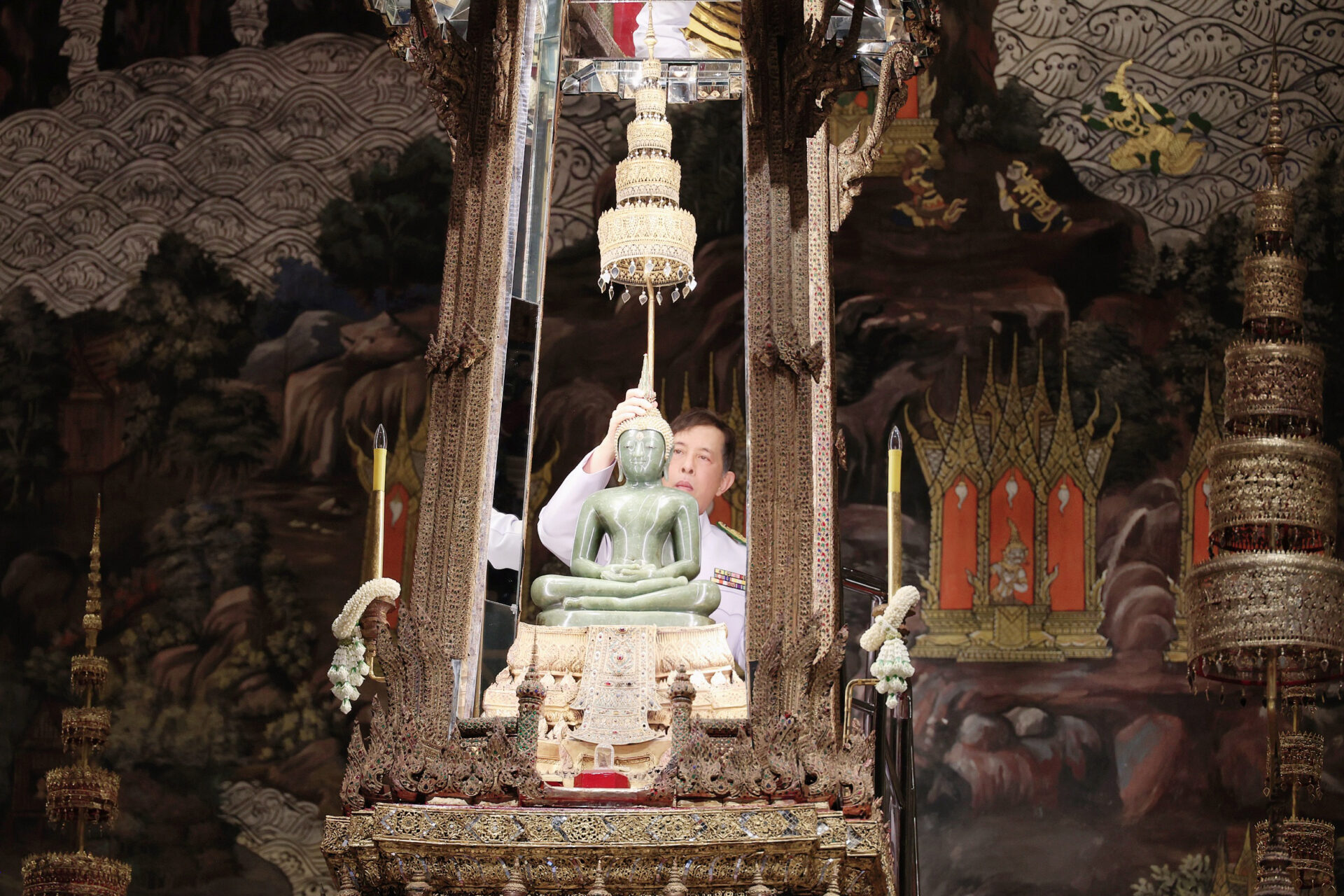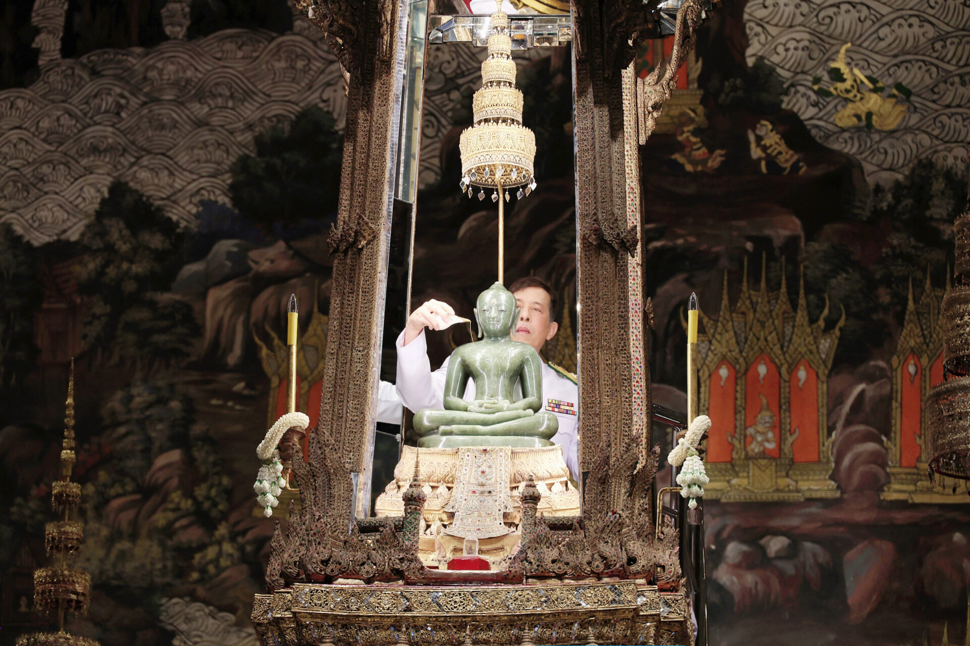 ในการนี้ เสด็จพระราชดำเนินไปด้านหลังฐานชุกชี ขึ้นเกยไปยังบุษบกที่ประดิษฐานพระพุทธมหามณีรัตนปฏิมากร ถวายพวงมาลัยสักการะพระพุทธมหามณีรัตนปฏิมากร ทรงกราบ แล้วทรงถอดมงกุฎจากพระเศียรพระพุทธมหามณีรัตนปฏิมากร มอบเจ้าพนักงานภูษามาลา ทรงหยิบพระมหาสังข์ประจำพระองค์พระพุทธมหามณีรัตนปฏิมากร ทรงสรงพระสุคนธ์ที่พระอังสาซ้ายขวาพระพุทธมหามณีรัตนปฏิมากร เสร็จแล้วทรงวางพระมหาสังข์ไว้ที่เดิม ทรงรับพระมหาสังข์ทักษิณาวัฏจากเจ้าพนักงานภูษามาลา แล้วทรงสรงพระสุคนธ์ที่พระอังสาซ้ายขวาพระพุทธมหามณีรัตนปฏิมากร เสร็จแล้วทรงคืนพระมหาสังข์ทักษิณาวัฏให้เจ้าพนักงานภูษามาลา ทรงรับผ้าขาวจากเจ้าพนักงานภูษามาลาซับตามองค์พระพุทธมหามณีรัตนปฏิมากร เสร็จแล้ว ทรงรับมงกุฎประจำฤดูฝนจากเจ้าพนักงานภูษามาลา ทรงสวมถวายที่พระเศียรพระพุทธมหามณีรัตนปฏิมากร