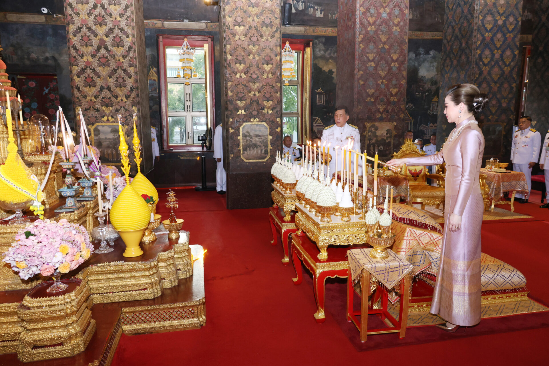 จากนั้น เสด็จขึ้นไปบนฐานชุกชี ทรงถวายพุ่มเทียนและธูปเทียนแพ ทรงจุดธูปเทียนเครื่องนมัสการท้ายที่นั่งบูชาพระพุทธรูปประจำพระชนมพรรษา 50 พรรษา พระบาทสมเด็จพระบรมชนกาธิเบศร มหาภูมิพลอดุลยเดชมหาราช บรมนาถบพิตร, ทรงวางพวงมาลัยถวายราชสักการะ พระบรมราชสรีรางคาร พระบาทสมเด็จพระบรมชนกาธิเบศร มหาภูมิพลอดุลยเดชมหาราช บรมนาถบพิตร ทรงถวายพุ่มเทียนและธูปเทียนแพ ทรงจุดธูปเทียนเครื่องนมัสการท้ายที่นั่งบูชาพระพุทธรูปประจำพระชนมวาร สมเด็จพระนางเจ้าสิริกิติ์ พระบรมราชินีนาถ พระบรมราชชนนีพันปีหลวง เสร็จแล้ว เสด็จลงจากฐานชุกชี