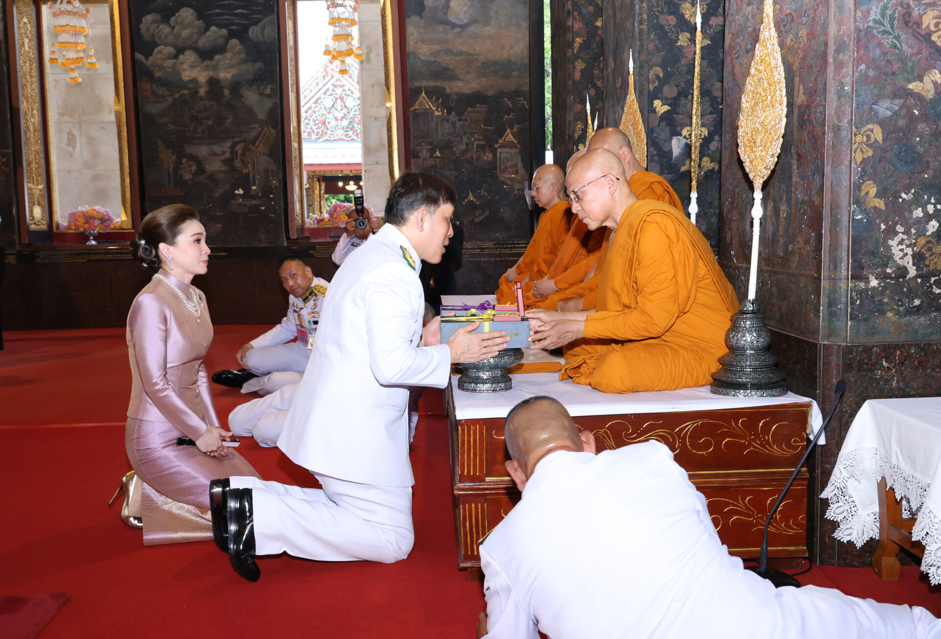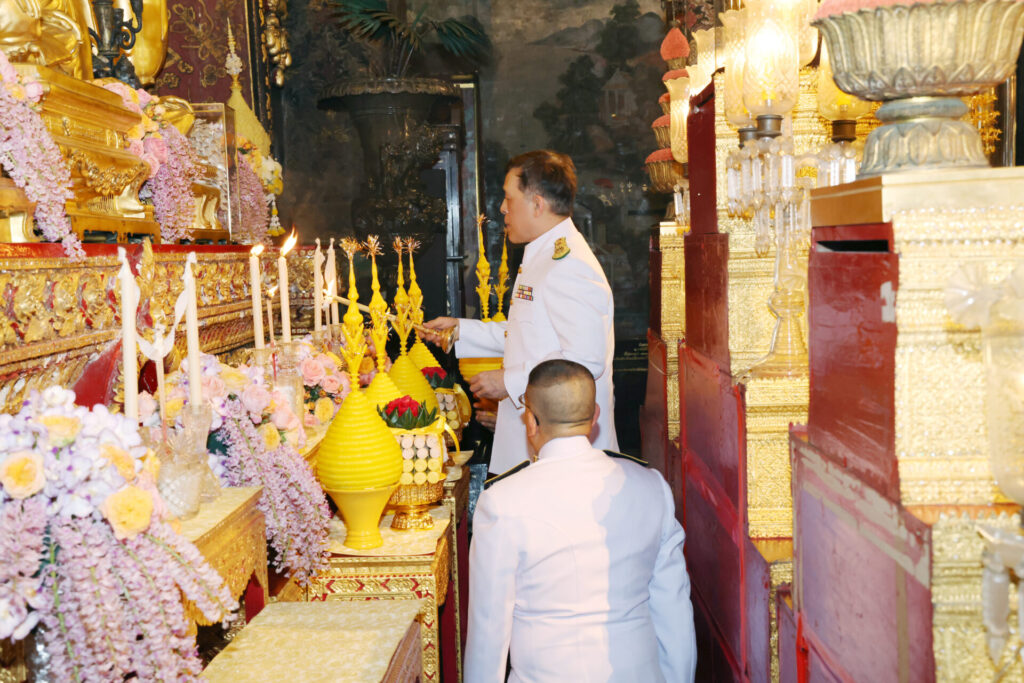 พระบาทสมเด็จพระเจ้าอยู่หัว และสมเด็จพระนางเจ้า ฯ พระบรมราชินี เสด็จพระราชดำเนินไปทรงจุดธูปเทียนเครื่องนมัสการทองทิศบูชาพระพุทธชินสีห์ และทรงจุดธูปเทียนเครื่องทองน้อยถวายราชสักการะพระบรมราชสรีรางคาร พระบาทสมเด็จพระมงกุฎเกล้าเจ้าอยู่หัว และพระบาทสมเด็จพระบรมชนกาธิเบศร มหาภูมิพลอดุลยเดชมหาราช บรมนาถบพิตร ทรงกราบ จากนั้น พระบาทสมเด็จพระเจ้าอยู่หัว เสด็จพระราชดำเนินไปทรงถวายพุ่มเทียนและธูปเทียนแพ แด่พระธรรมวชิรญาณ เจ้าอาวาสวัดบวรนิเวศวิหาร เสร็จแล้ว เสด็จพระราชดำเนินไปทรงกราบที่หน้าเครื่องนมัสการ ทรงลาพระสงฆ์ จากนั้น เสด็จพระราชดำเนินไปพระเจดีย์หลังพระอุโบสถ ทรงถวายพุ่มเทียนและธูปเทียนแพ แล้วทรงจุดธูปเทียนเครื่องทองน้อยบูชาพระบรมสารีริกธาตุ