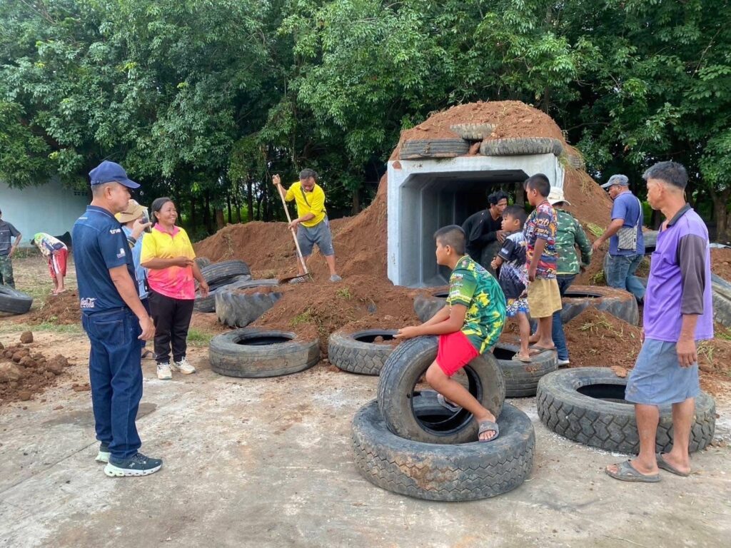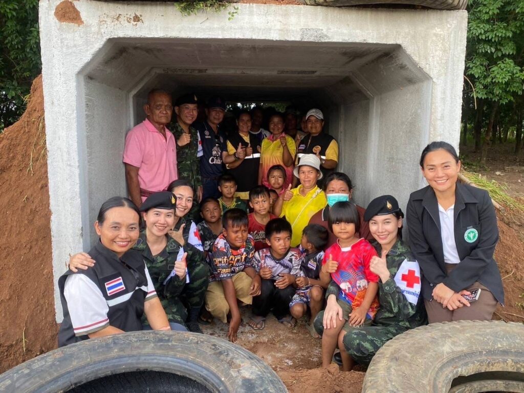 มูลนิธิชัยพัฒนาได้ประสานกับ ชรบ.หมู่บ้านดังกล่าว เพื่อร่วมกันดำเนินการก่อสร้างหลุมหลบภัยพระราชทาน โดยมูลนิธิฯ ได้จัดส่งวัสดุอุปกรณ์ก่อสร้างเข้าสู่พื้นที่ และผู้นำชุมชนและชาวบ้านในพื้นที่ได้ช่วยกันก่อสร้างหลุมหลบภัยแบบใช้ท่อคอนกรีตสำเร็จรูปสี่เหลี่ยม (box culvert) ขนาดกว้าง 1.8 เมตร ยาว 1.8 เมตร ลึก 1 เมตร จำนวน 6 บล็อค วางติดกัน สามารถรองรับประชาชนได้ประมาณ 50–60 คน การก่อสร้างจะแล้วเสร็จในวันที่ 11 สิงหาคม 2568 . – 211 สำนักข่าวไทย