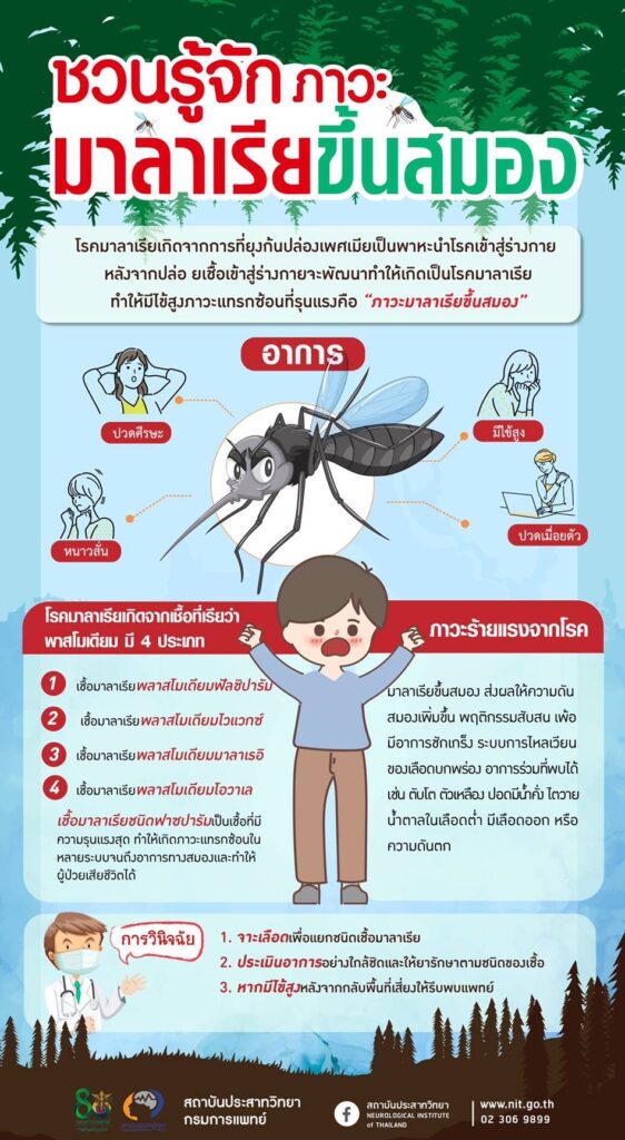 กรุงเทพฯ 20 ส.ค. – สถาบันประสาทวิทยา กรมการแพทย์ เผยโรคมาลาเรียเกิดจากการที่ยุงก้นปล่องเพศเมียเป็นพาหะนำโรคเข้าสู่ร่างกาย หลังจากปล่อยเชื้อเข้าสู่ร่างกายจะพัฒนาให้เกิดเป็นโรคมาลาเรีย ทำให้มีไข้สูง ภาวะแทรกซ้อนที่รุนแรงคือ “ภาวะมาลาเรียขึ้นสมอง”