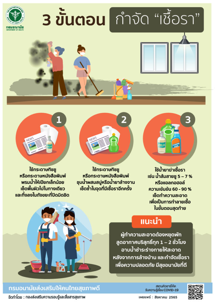 3.ใช้น้ำยาฆ่าเชื้อรา เช่น น้ำส้มสายชู 5-7 เปอร์เซ็นต์ หรือแอลกอฮอล์ความเข้มข้น 60-90 เปอร์เซ็นต์ เช็ดทำความสะอาด เพื่อเป็นการทำลายเชื้อในขั้นตอนสุดท้าย โดยผู้ทำความสะอาดต้องหยุดพักสูดอากาศบริสุทธิ์ ทุก 1-2 ชั่วโมง อาบน้ำชำระร่างกายให้สะอาดหลังจากการล้างบ้านและกำจัดเชื้อรา เพื่อความปลอดภัยและสุขอนามัยที่ดี” อธิบดีกรมอนามัย กล่าว .-สำนักข่าวไทย