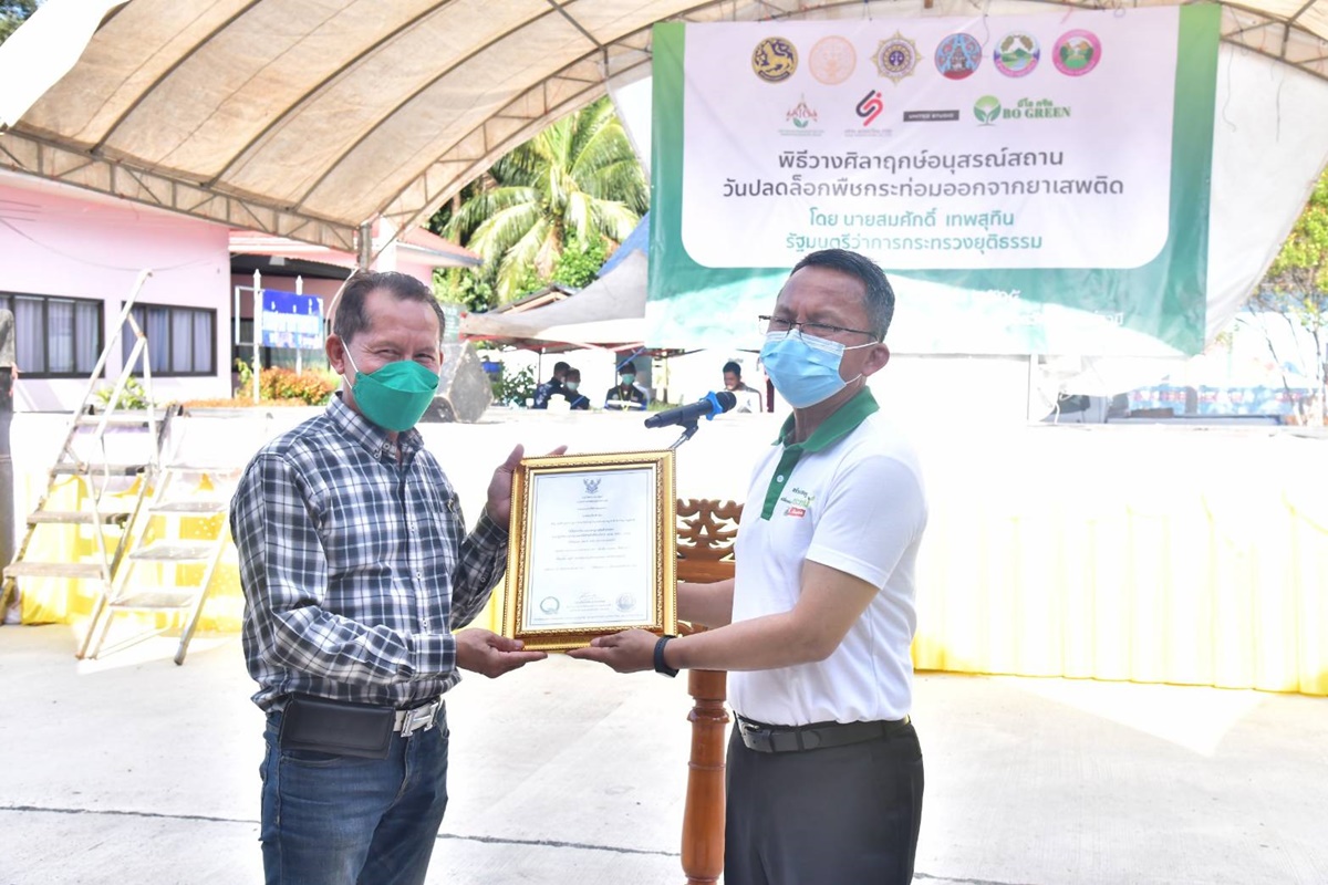 จากนั้น นายสมศักดิ์ ได้มอบใบประกาศรับรองแปลงกระท่อม 6 แปลงแรก ที่ได้รับมาตรฐาน GAP คือ แนวทางในการทำการเกษตร เพื่อให้ได้ผลผลิตที่มีคุณภาพดีและปลอดภัยตามมาตรฐานที่กำหนด จากสำนักวิจัยและพัฒนาการเกษตรเขตที่ 7 และได้เดินทางไปรับชมแปลงพืชกระท่อมทั้ง 6 แปลงด้วย
