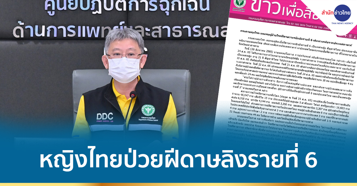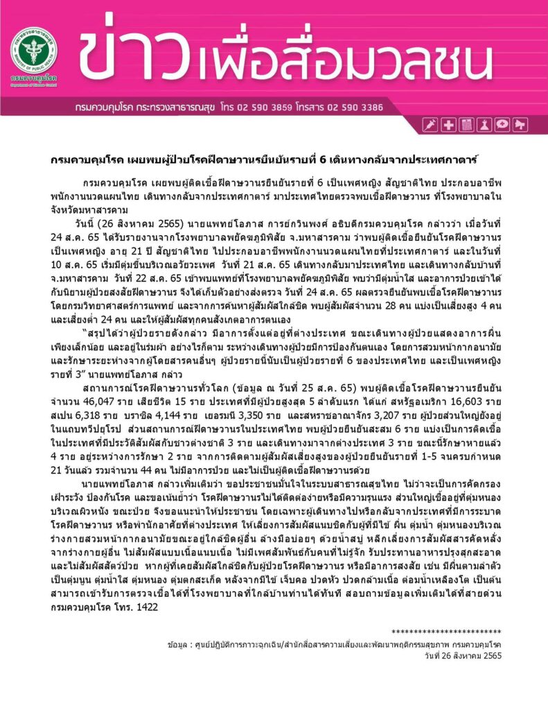 สธ. 26 ส.ค.- กรมควบคุมโรค เผยพบผู้ติดเชื้อฝีดาษวานร ยืนยันรายที่ 6 เป็นเพศหญิง สัญชาติไทย ประกอบอาชีพพนักงานนวดแผนไทย เดินทางกลับจากกาตาร์ มาประเทศไทยตรวจพบเชื้อฝีดาษวานร ที่โรงพยาบาลในจังหวัดมหาสารคาม