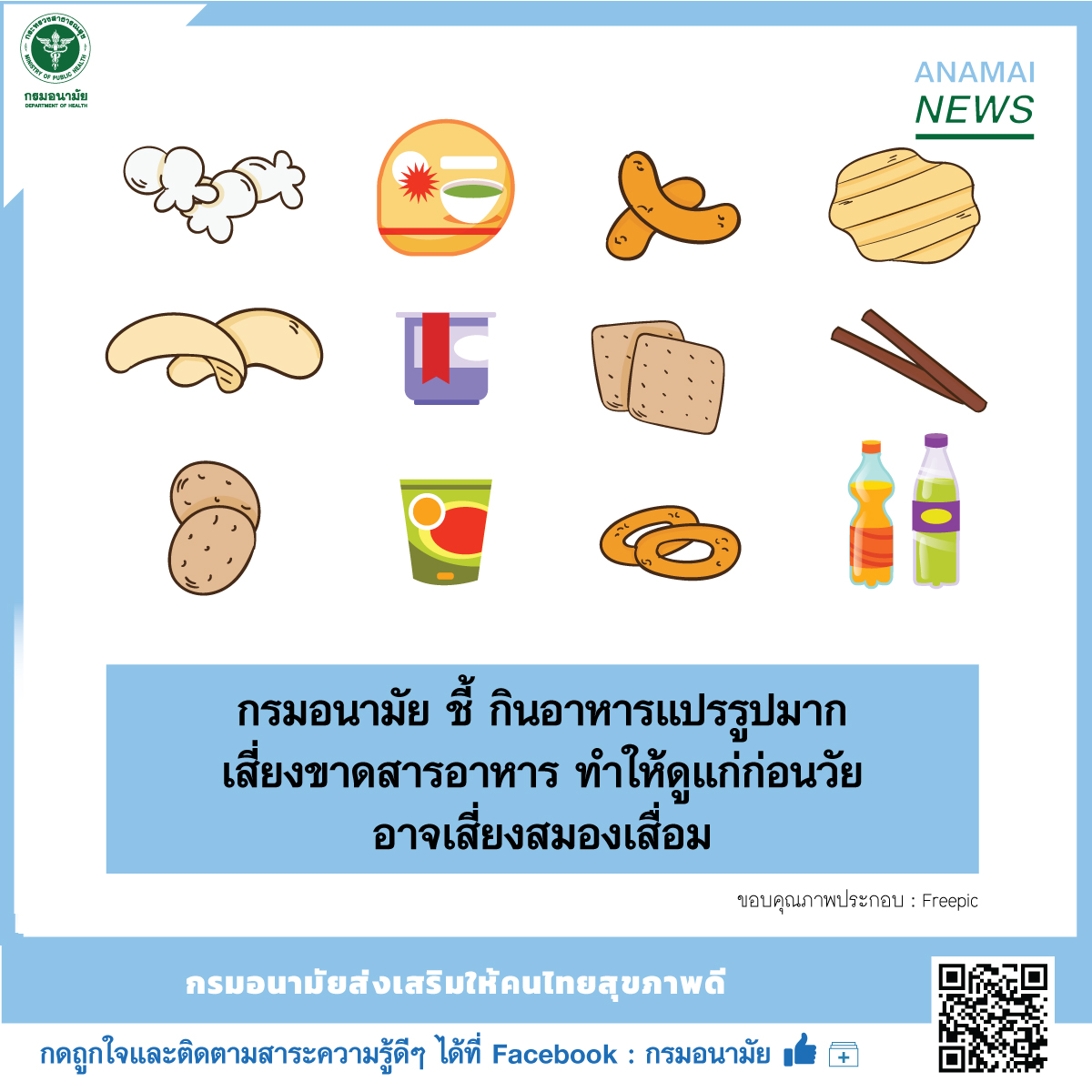 นพ.สุวรรณชัย วัฒนายิ่งเจริญชัย อธิบดีกรมอนามัย กล่าวว่า วิถีชีวิตที่เร่งรีบของสังคมเมือง และความเครียดสะสมจากการทำงาน ทำให้ประชาชนส่วนใหญ่ไม่มีเวลาดูแลตนเอง โดยเฉพาะการเลือกกินอาหาร มีแนวโน้มบริโภคอาหารสำเร็จรูปหรืออาหารแปรรูปมากขึ้น เช่น น้ำอัดลม มันฝรั่งทอด ไส้กรอกรมควัน เบคอน แฮม ขนมขบเคี้ยว อาหารแช่แข็ง บะหมี่กึ่งสำเร็จรูป อาหารบรรจุกระป๋อง อาหารแปรรูปตามท้องตลาดส่วนใหญ่ผ่านการจัดเตรียม ปรุงรส กลิ่น ปรับเปลี่ยนรูปร่าง บรรจุภัณฑ์ เพื่อให้ง่ายต่อการกินและเก็บรักษา อาหารแปรรูปบางชนิดมีการเติมส่วนผสมต่างๆ เช่น สารให้ความหวานแทนน้ำตาล สารเติมแต่งอาหารเพื่อเพิ่มสีสันและกลิ่นให้น่ากิน สารกันบูดเพื่อคงความสดใหม่และยืดอายุการเก็บรักษา บางชนิดอาจใส่น้ำตาลธรรมชาติ หรือน้ำตาลฟรุกโตสชนิดพิเศษ (High Fructose Corn Syrup) มากเกินไป เพื่อให้อาหารมีรสชาติ เนื้อสัมผัส และสีตามที่ต้องการ ส่งผลให้อาหารแปรรูปมีปริมาณน้ำตาล โซเดียม และไขมันอิ่มตัวสูง ซึ่งหากกินในปริมาณที่มากเกินไป และติดต่อกันเป็นระยะเวลานาน อาจส่งผลเสียต่อสุขภาพ ทำให้ร่างกายขาดสารอาหาร ผิวพรรณเหี่ยวย่น หย่อนคล้อย ดูแก่ก่อนวัย และเสี่ยงสมองเสื่อมได้