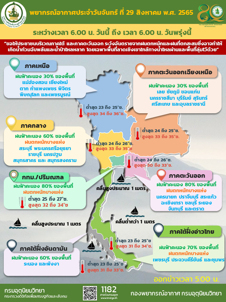 กรมอุตุนิยมวิทยา พยากรณ์อากาศ 24 ชั่วโมงข้างหน้า ลมตะวันออกเฉียงใต้พัดปกคลุมบริเวณภาคตะวันออกเฉียงเหนือตอนล่าง ภาคกลางตอนล่าง รวมทั้งกรุงเทพมหานครและปริมณฑล และภาคตะวันออก ประกอบกับมรสุมตะวันตกเฉียงใต้กำลังอ่อนพัดปกคลุมทะเลอันดามัน ประเทศไทย และอ่าวไทย ลักษณะเช่นนี้ทำให้ประเทศไทยยังคงมีฝนฟ้าคะนองเกิดขึ้นได้ และมีฝนตกหนักบางแห่งบริเวณภาคกลางตอนล่าง รวมทั้งกรุงเทพมหานครและปริมณฑล ภาคตะวันออก และภาคใต้ฝั่งตะวันออก ขอให้ประชาชนในบริเวณดังกล่าวระวังอันตรายจากฝนตกหนักที่อาจจะเกิดขึ้นในระยะนี้ไว้ด้วย