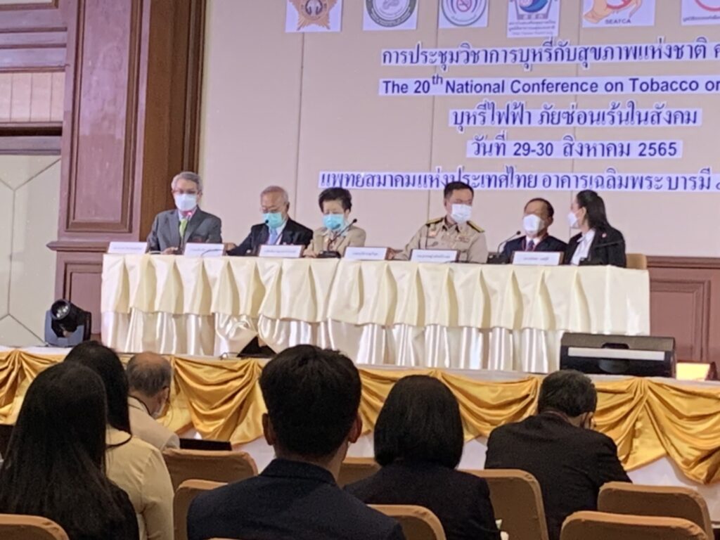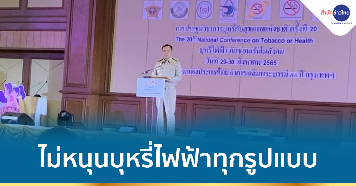 นายอนุทิน ชาญวีรกุล รัฐมนตรีว่าการะทรวงสาธารณสุข เป็นประธานเปิดการประชุมวิชาการ “บุหรี่กับสุขภาพแห่งชาติ” ครั้งที่ 20 เรื่อง “บุหรี่ไฟฟ้า ภัยซ่อนเร้นในสังคม” พร้อมระบุว่าบุหรี่ไฟฟ้าไม่ใช่เรื่องใหม่ ทั่วโลกทราบดีว่าบุหรี่ไฟฟ้าไม่ปลอดภัย และทำให้มีนักสูบหน้าใหม่เกิดขึ้น สำนักงานสถิติแห่งชาติ ปี 2564 สำรวจพบคนไทยอายุ 15 ปีขึ้นไป สูบบุหรี่ไฟฟ้าถึง 80,000 คน ในจำนวนนี้มากกว่าครึ่งเป็นเยาวชนอายุ 15-24 ปี สิ่งที่น่าเป็นห่วง คือ บุหรี่ไฟฟ้า ทำให้เยาวชนที่ไม่เคยคิดจะสูบุหรี่เริ่มต้นอยากลองสูบบุหรี่เร็วขึ้น ทำให้มีโอกาสได้รับผลกระทบจากควันบุหรี่นานขึ้นตามไปด้วย บุหรี่ไฟฟ้าก่อให้เกิดผลกระทบในวงกว้าง ทั้งทางด้านเศรษฐกิจ สังคมและสิ่งแวดล้อม โดยเฉพาะมีผลทำลายสมองที่กำลังเติบโตของเด็กและเยาวชน ซึ่งถือเป็นอนาคตของชาติ เป็นทรัพยากรที่มีค่ามหาศาลที่เราทุกคนจะต้องดูแล จึงต้องช่วยกันป้องกัน และส่งเสริมให้เขามีความรู้เท่าทันภัยบุหรี่ในทุกมิติ