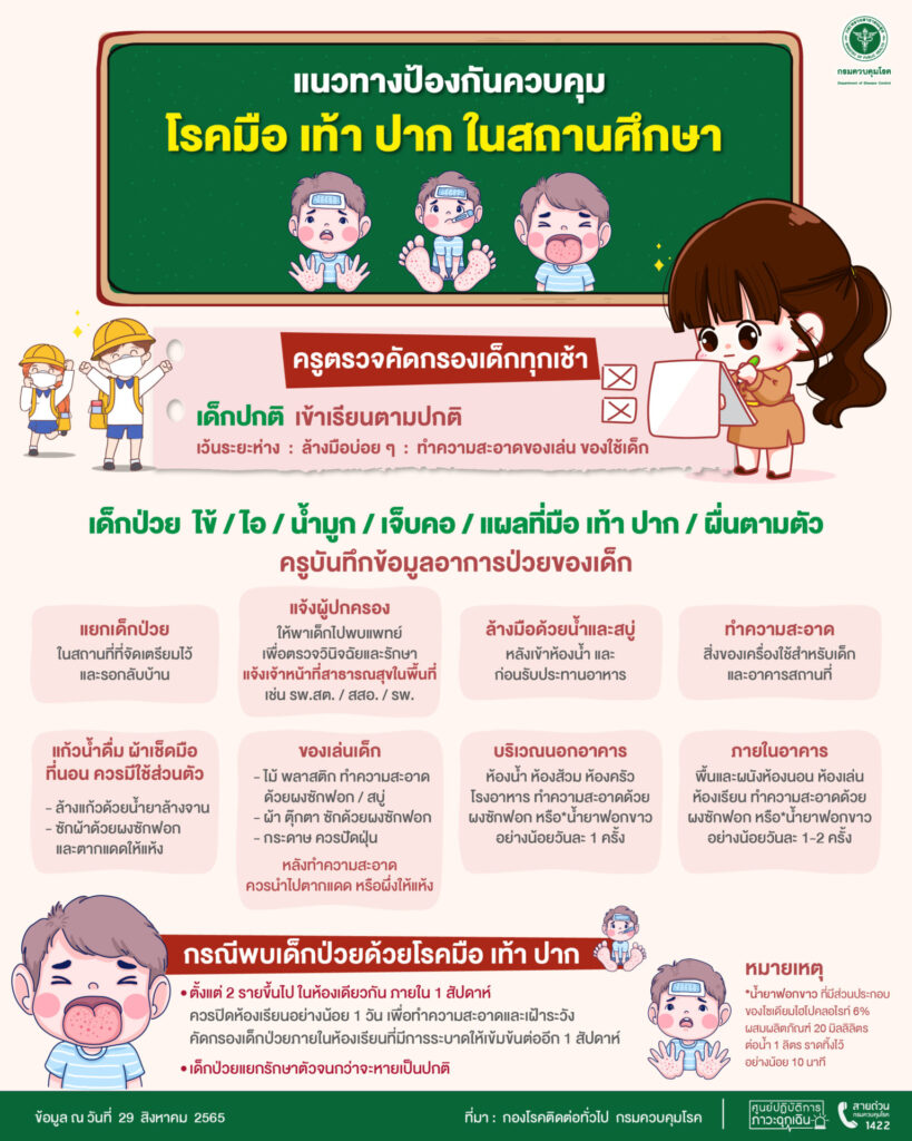 กรุงเทพฯ 29 ส.ค. – กรมควบคุมโรค เผยพบเด็กอายุต่ำกว่า 5 ปี ป่วยด้วยโรคมือ เท้า ปาก มากกว่า 80% ย้ำผู้ปกครอง สถานศึกษา ตรวจคัดกรอง สังเกตอาการเด็กก่อนเข้าเรียน พบเด็กป่วยให้แยกออกจากเด็กปกติ แจ้งผู้ปกครองรับกลับบ้าน หากอาการไม่ดีขึ้นรีบพาพบแพทย์โดยเร็ว