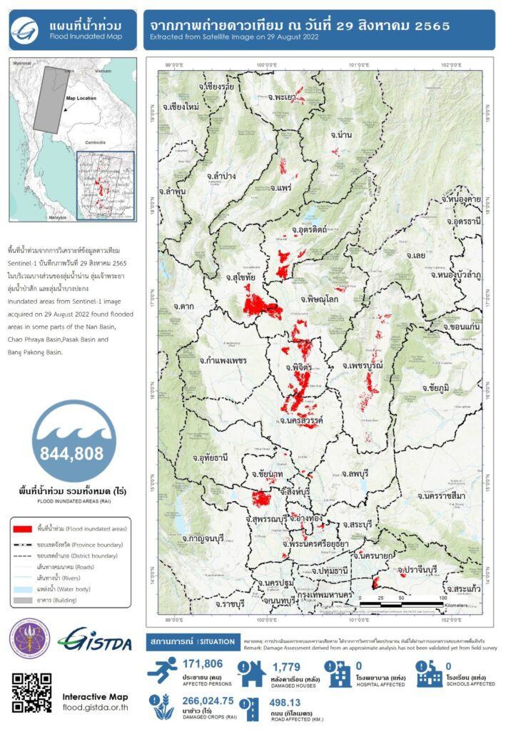 GISTDA เผยข้อมูลจากดาวเทียม Sentinel-1 (เซนทิเนล -1) ของวันที่ 29 สิงหาคม 2565 พบน้ำท่วมในพื้นที่ 4 ลุ่มน้ำหลักของประเทศ ได้แก่ ลุ่มน้ำน่าน ลุ่มน้ำเจ้าพระยา ลุ่มน้ำป่าสัก และลุ่มน้ำบางปะกง สูงถึง 844,799 ไร่ ประกอบด้วย สุโขทัย 189,337 ไร่ พิจิตร 156,222 ไร่ นครสวรรค์ 122,233 ไร่ พิษณุโลก 91,382 ไร่ อุตรดิตถ์ 88,633 ไร่ สุพรรณบุรี 70,033 ไร่ เพชรบูรณ์ 41,035 ไร่ ปราจีนบุรี 23,641 ไร่ ชัยนาท 17,721 ไร่ อ่างทอง 9,344 ไร่ พระนครศรีอยุธยา 9,269 ไร่ พะเยา 7,662 ไร่ แพร่ 5,767 ไร่ นครนายก 5,763 ไร่ น่าน 2,738 ไร่ ลพบุรี 2,353 ไร่ ฉะเชิงเทรา 1,508 ไร่ และสระบุรี 167 ไร่ ขณะที่ข้อมูลจากดาวเทียมยังพบว่าพื้นที่ปลูกข้าวได้รับผลกระทบแล้วกว่า 266,024 ไร่ บ้านเรือนประชาชนได้รับความเดือดร้อนกว่า 1,700 หลังคาเรือน