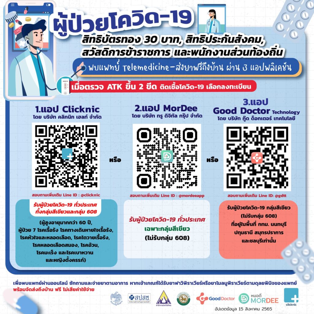 ทพ.อรรถพร ลิ้มปัญญาเลิศ รองเลขาธิการสำนักงานหลักประกันสุขภาพแห่งชาติ (สปสช.) ในฐานะโฆษก สปสช. เปิดเผยว่า จากการให้บริการแพทย์ทางไกลตั้งแต่วันที่ 11 กรกฎาคมถึงวันที่ 30 สิงหาคม 2565 มีผู้ป่วยโควิด-19 เข้ารับบริการสะสม 9,043 ครั้ง หรือเฉลี่ย 177.3 ครั้ง/วัน แบ่งเป็นการเข้ารับบริการกับแอป Good Doctor 4,942 ครั้ง, แอป MorDee 1,950 ครั้ง และแอป Clicknic 2,151 ครั้ง