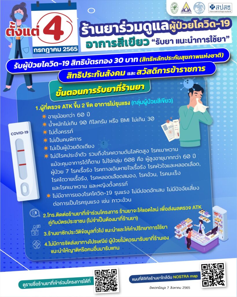 นอกจากนี้ สปสช.ยังได้ร่วมกับสภาเภสัชกรรมจัดบริการดูแลผู้ป่วยโควิด-19 โดยร้านยาด้วย “บริการผู้ป่วยนอกและแยกกักตัวที่บ้าน” (OP Self isolation) หรือเจอ แจก จบ ซึ่งที่ผ่านมามีร้านยาทั่วประเทศเข้าร่วมบริการ 532 แห่ง เริ่มให้บริการตั้งแต่วันที่ 24 มีนาคม 2565 จากข้อมูลบริการในระบบถึงวันที่ 29 สิงหาคม 2565 มีผู้ป่วยโควิด-19 เข้ารับบริการ 55,482 ครั้ง กรุงเทพฯ มีจำนวนรับบริการมากที่สุด 21,200 ครั้ง รองลงมาเป็นจังหวัดนนทบุรี 4,564 ครั้ง ชลบุรี 4,367 ครั้ง เชียงใหม่ 2,806 ครั้ง และนครปฐม 2,651 ครั้ง