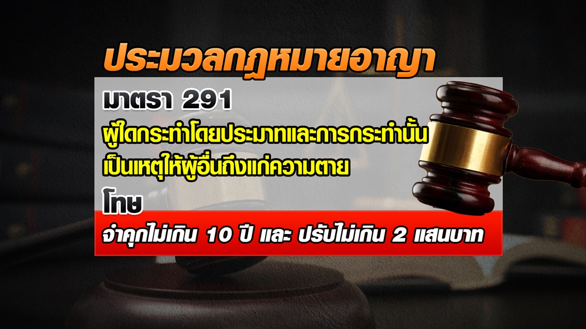 มาตรา 291 ผู้ใดกระทำโดยประมาท และการกระทำนั้นเป็นเหตุให้ผู้อื่นถึงแก่ความตาย ต้องระวางโทษจำคุกไม่เกิน 10 ปี และปรับไม่เกิน 200,000 บาท และยังสามารถฟ้องร้องเรียกค่าเสียหายในทางแพ่ง ตามกฎหมายให้ชดใช้ได้อีกต่อไป”